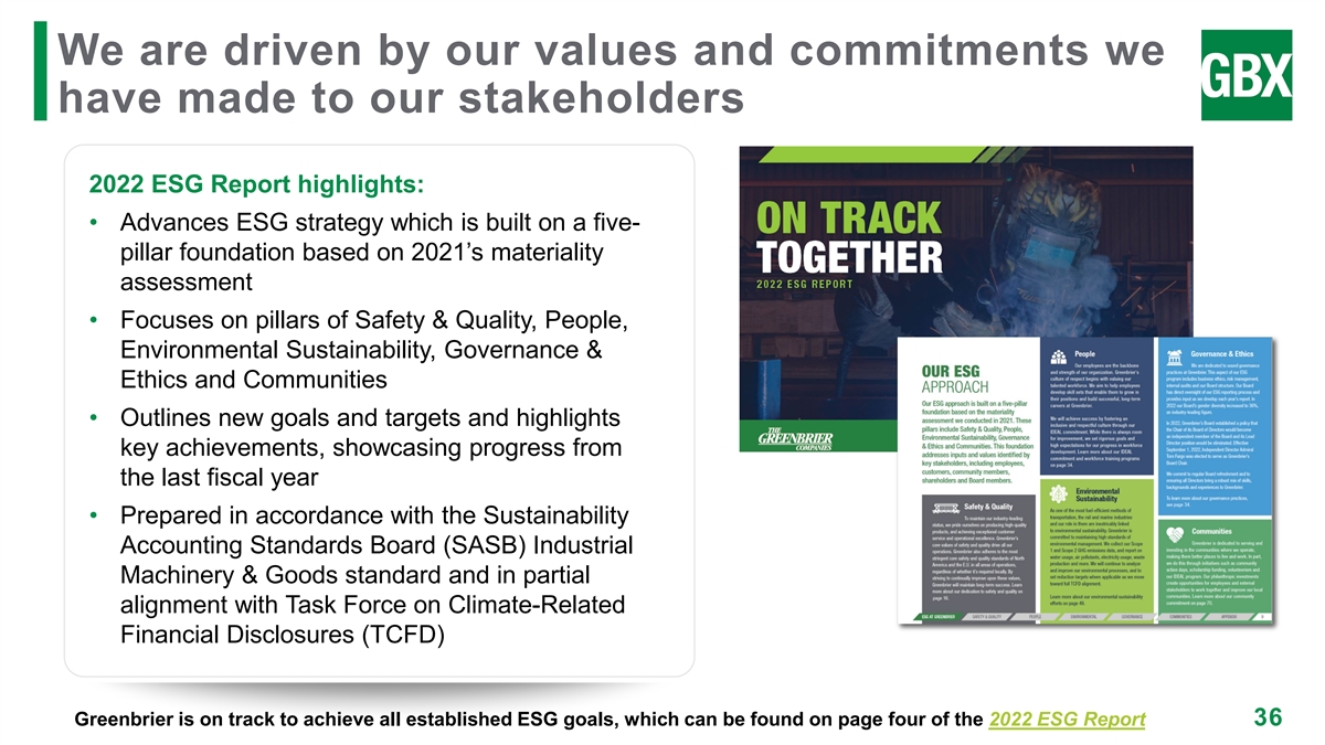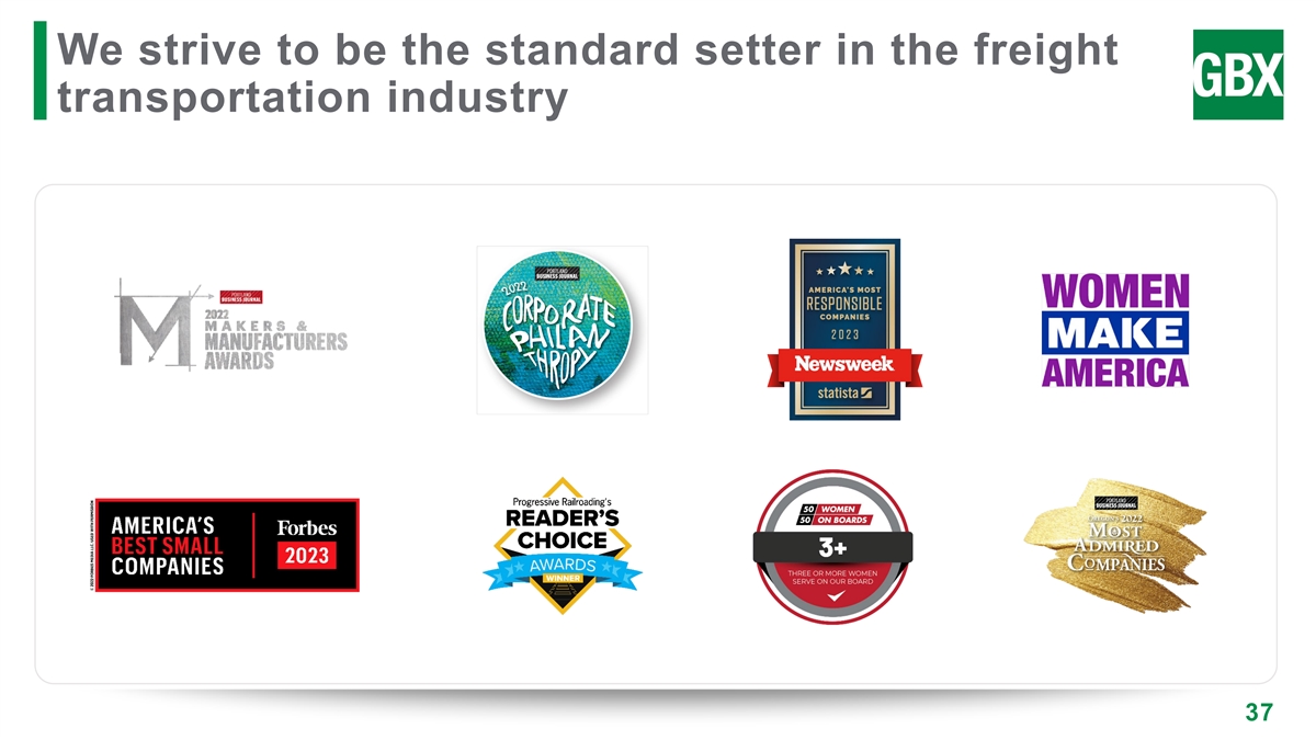 We are driven by our values and commitments we have made to our stakeholders 2022 ESG Report highlights: • Advances ESG strategy which is built on a five- pillar foundation based on 2021’s materiality assessment • Focuses on pillars of Safety & Quality, People, Environmental Sustainability, Governance & Ethics and Communities • Outlines new goals and targets and highlights key achievements, showcasing progress from the last fiscal year • Prepared in accordance with the Sustainability Accounting Standards Board (SASB) Industrial Machinery & Goods standard and in partial alignment with Task Force on Climate-Related Financial Disclosures (TCFD) Greenbrier is on track to achieve all established ESG goals, which can be found on page four of the 2022 ESG Report 36
