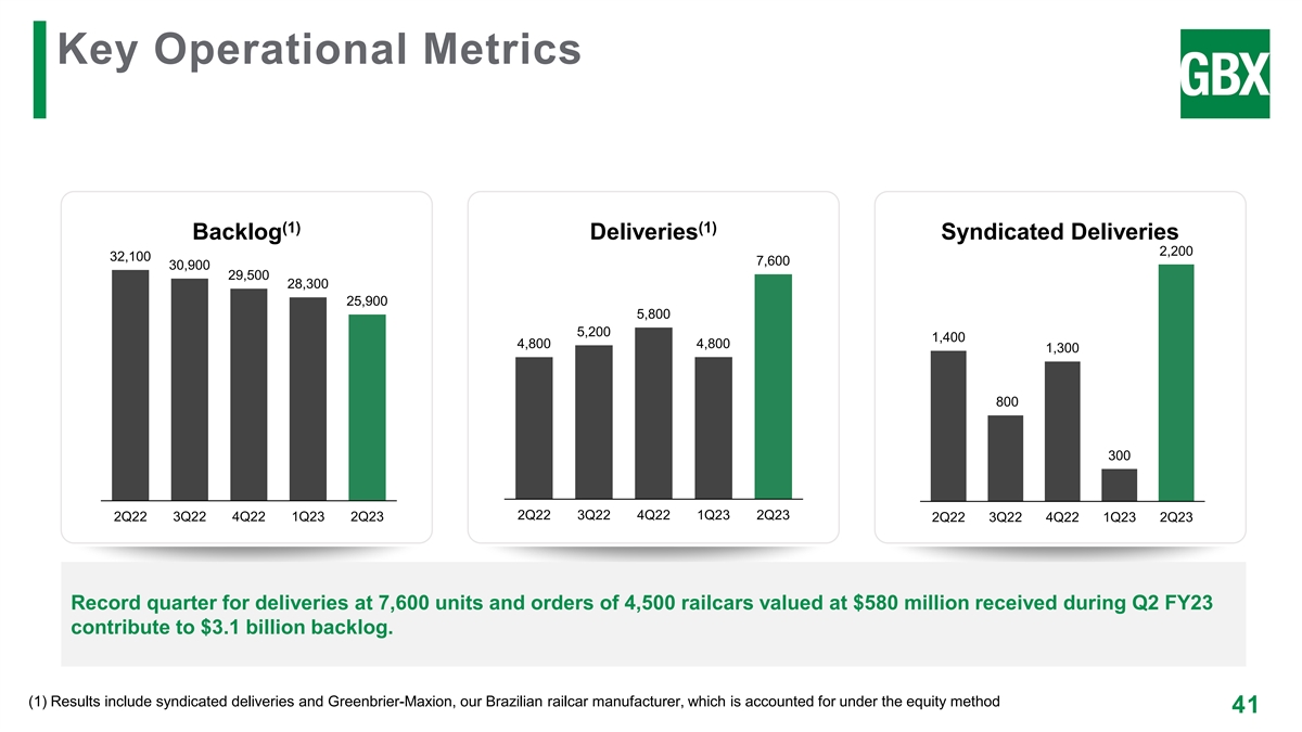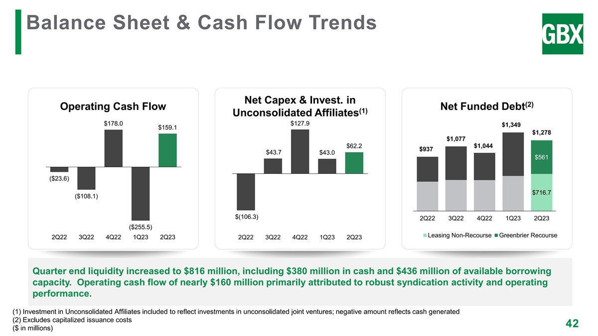 Key Operational Metrics (1) (1) Backlog Deliveries Syndicated Deliveries 2,200 32,100 7,600 30,900 29,500 28,300 25,900 5,800 5,200 1,400 4,800 4,800 1,300 800 300 2Q22 3Q22 4Q22 1Q23 2Q23 2Q22 3Q22 4Q22 1Q23 2Q23 2Q22 3Q22 4Q22 1Q23 2Q23 Record quarter for deliveries at 7,600 units and orders of 4,500 railcars valued at $580 million received during Q2 FY23 contribute to $3.1 billion backlog. (1) Results include syndicated deliveries and Greenbrier-Maxion, our Brazilian railcar manufacturer, which is accounted for under the equity method 41