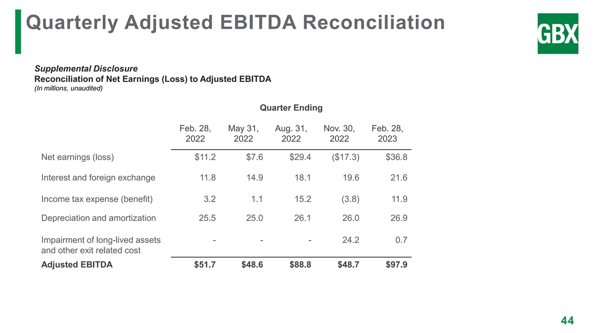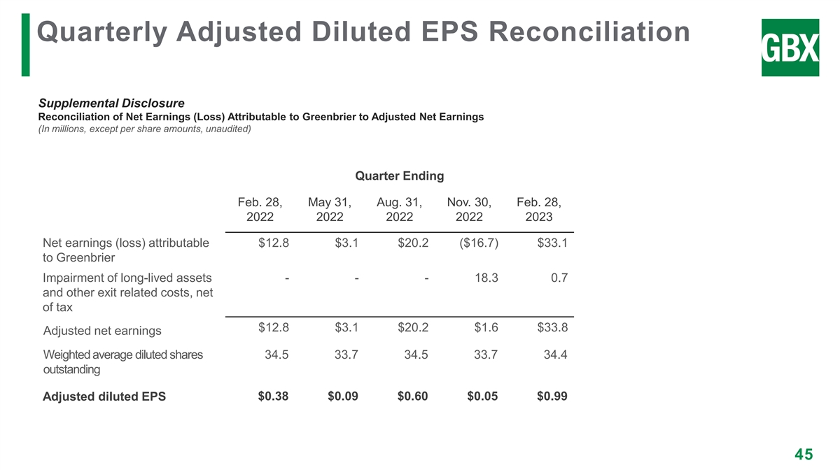 Quarterly Adjusted Diluted EPS Reconciliation Supplemental Disclosure Reconciliation of Net Earnings (Loss) Attributable to Greenbrier to Adjusted Net Earnings (In millions, except per share amounts, unaudited) Quarter Ending Feb. 28, May 31, Aug. 31, Nov. 30, Feb. 28, 2022 2022 2022 2022 2023 Net earnings (loss) attributable $12.8 $3.1 $20.2 ($16.7) $33.1 to Greenbrier Impairment of long-lived assets - - - 18.3 0.7 and other exit related costs, net of tax $12.8 $3.1 $20.2 $1.6 $33.8 Adjusted net earnings Weighted average diluted shares 34.5 33.7 34.5 33.7 34.4 outstanding $0.38 $0.09 $0.60 $0.05 $0.99 Adjusted diluted EPS 45