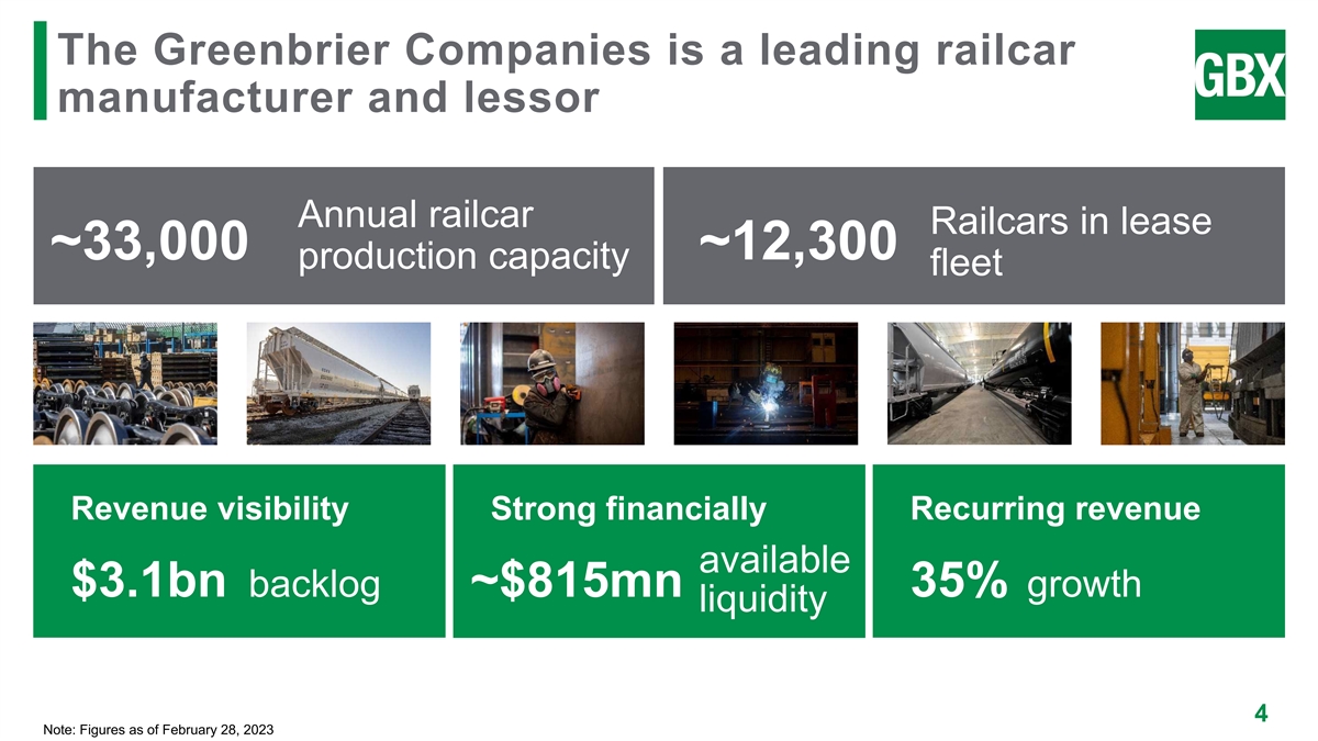 Forward Looking Statements & Non-GAAP Financial Measures This presentation and the accompanying oral presentation contain forward-looking statements, including statements that are not purely statements of historical fact. The Greenbrier Companies, Inc. (the “Company,” “we,” “us” or “our”) uses words, and variations of words, such as “approach,” “believe,” “change,” “create,” “commitment,” “continue,” “demand,” “drive,” “enhance,” “evolve,” “expect,” “focus,” “foundation,” “goal,” “grow,” “help,” “identify,” “invest,” “maintain,” “provide,” “position,” “potential,” “reduce,” “should,” “strategic,” “strengthen,” “superior,” “target,” “trend,” “will,” and similar expressions to identify forward-looking statements. These forward-looking statements include, without limitation, statements about backlog and other orders, production capacity, railcar deliveries, leasing operations and performance, expectations for operating segments, environmental, social and governance commitments, financing, future liquidity, revenue, cash flow, strategic initiatives, partnerships, tax treatment, and other information regarding future performance and strategies and appear throughout this presentation. These forward- looking statements are not guarantees of future performance and are subject to certain risks, uncertainties and important factors that could cause actual results to differ materially from the results contemplated by the forward-looking statements. Such risks, uncertainties and important factors that might cause such a difference include, but are not limited to, the following: an economic downturn and economic uncertainty; inflation (including rising energy prices, interest rates, wages and other escalators) and policy reactions thereto (including actions by central banks); disruptions in the supply of materials and components used in the production of our products; the war in Ukraine and related events, and the COVID-19 pandemic, variants thereof, governmental reaction thereto, and related economic disruptions (including, among other factors, operations and supply disruptions and labor shortages). Our backlog of railcar units and other orders not included in backlog are not necessarily indicative of future results of operations. Certain orders in backlog are subject to customary documentation which may not occur. There may be other factors that may cause our actual results to differ materially from the forward-looking statements, including the risks, uncertainties and factors described in more detail in the Company’s filings with the SEC, including in the “Risk Factors” and “Management’s Discussion and Analysis of Financial Condition and Results of Operations” sections of the Company’s most recently filed Annual Report on Form 10-K and subsequent Quarterly Reports on Form 10-Q. Except as otherwise required by law, the Company assumes no obligation to update any forward-looking statements or information, which speak as of their respective dates. Readers are cautioned not to place undue reliance on these forward-looking statements, which reflect management’s opinions only as of the date hereof. This presentation includes certain financial measures that were not prepared in accordance with generally accepted accounting principles (GAAP) because we believe they help investors understand our performance. Adjusted EBITDA and Adjusted diluted earnings per share (EPS) are not financial measures under GAAP. These metrics are performance measurement tools used by rail supply companies and Greenbrier. You should not consider these metrics in isolation or as a substitute for other financial statement data determined in accordance with GAAP. In addition, because these metrics are not a measure of financial performance under GAAP and are susceptible to varying calculations, the measures presented may differ from and may not be comparable to similarly titled measures used by other companies. We define Adjusted EBITDA as Net earnings (loss) before Interest and foreign exchange, Income tax benefit (expense), Depreciation and amortization and the impact associated with items we do not believe are indicative of our core business or which affect comparability. We believe the presentation of Adjusted EBITDA provides useful information as it excludes the impact of financing, foreign exchange, income taxes and the accounting effects of capital spending and other items. These items may vary for different companies for reasons unrelated to the overall operating performance of a company’s core business. We believe this assists in comparing our performance across reporting periods. Reconciliations of GAAP financial measures to Non-GAAP financial measures are contained in this presentation and on our 2 website at gbrx.com under “Investors”.