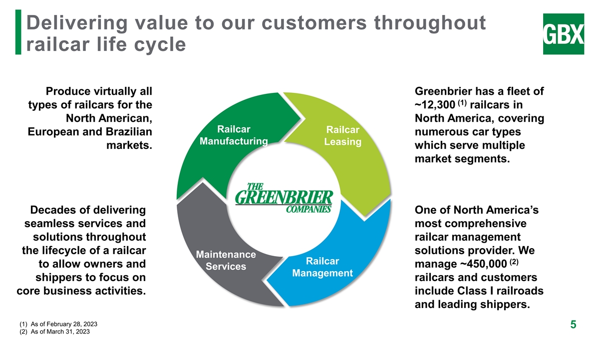 The Greenbrier Companies is a leading railcar manufacturer and lessor Annual railcar Railcars in lease ~33,000 ~12,300 production capacity fleet Revenue visibility Strong financially Recurring revenue available $3.1bn backlog ~$815mn 35% growth liquidity 4 Note: Figures as of February 28, 2023