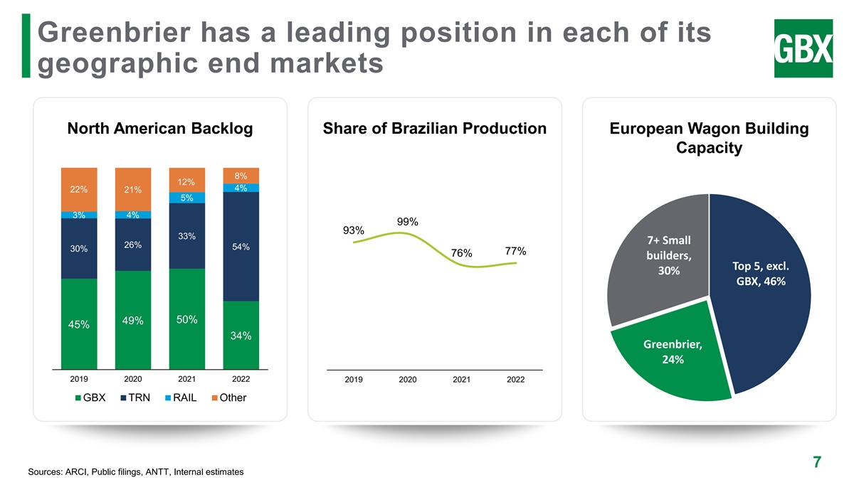 Greenbrier has a leading position in each of its geographic end markets North American Backlog Share of Brazilian Production European Wagon Building Capacity 8% 12% 4% 22% 21% 5% 4% 3% 99% 93% 33% 7+ Small 26% 54% 30% 77% 76% builders, Top 5, excl. 30% GBX, 46% 50% 49% 45% 34% Greenbrier, 24% 2019 2020 2021 2022 2019 2020 2021 2022 GBX TRN RAIL Other 7 Sources: ARCI, Public filings, ANTT, Internal estimates