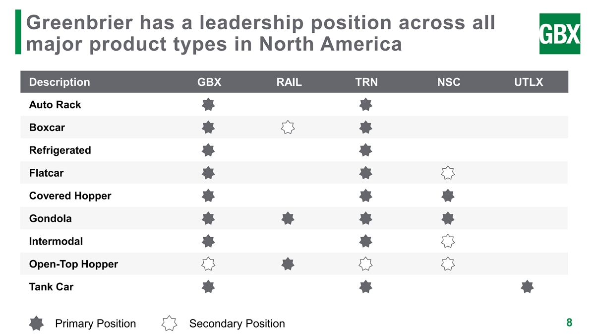 Greenbrier has a leadership position across all major product types in North America Description GBX RAIL TRN NSC UTLX Auto Rack Boxcar Refrigerated Flatcar Covered Hopper Gondola Intermodal Open-Top Hopper Tank Car 8 Primary Position Secondary Position