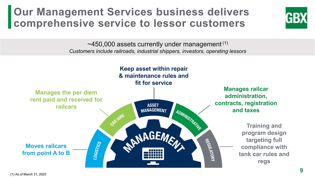 Our Management Services business delivers comprehensive service to lessor customers (1) ~450,000 assets currently under management Customers include railroads, industrial shippers, investors, operating lessors Keep asset within repair & maintenance rules and fit for service Manages railcar Manages the per diem administration, rent paid and received for contracts, registration railcars and taxes Training and program design targeting full Moves railcars compliance with from point A to B tank car rules and regs 9 (1) As of March 31, 2023