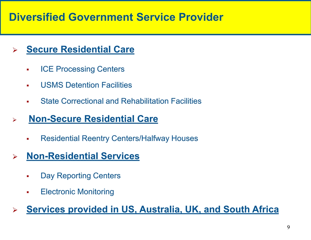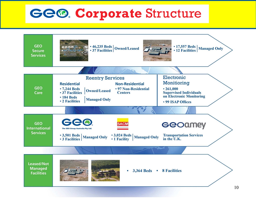 Diversified Government Service Provider Ø Secure Residential Care § ICE Processing Centers § USMS Detention Facilities § State Correctional and Rehabilitation Facilities Ø Non-Secure Residential Care § Residential Reentry Centers/Halfway Houses Ø Non-Residential Services § Day Reporting Centers § Electronic Monitoring Ø Services provided in US, Australia, UK, and South Africa 9