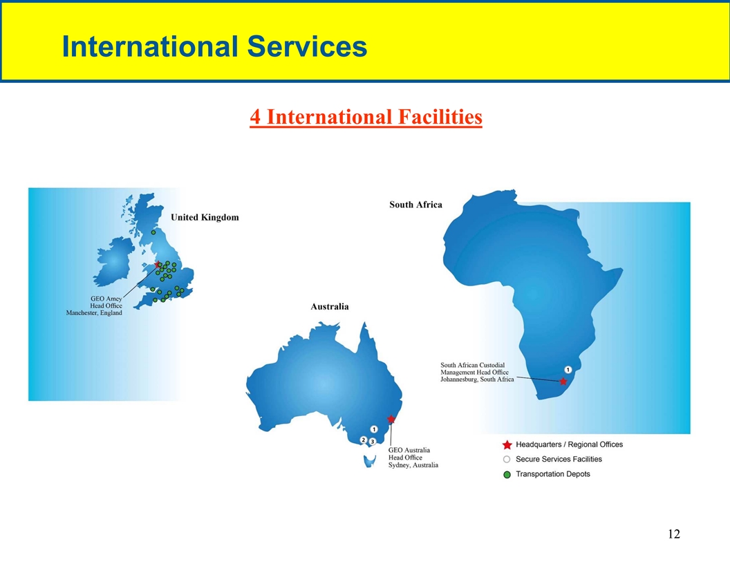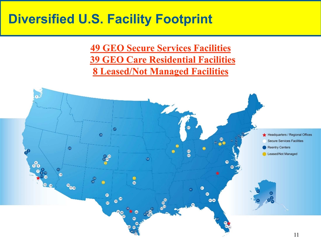 Diversified U.S. Facility Footprint 49 GEO Secure Services Facilities 39 GEO Care Residential Facilities 8 Leased/Not Managed Facilities 11