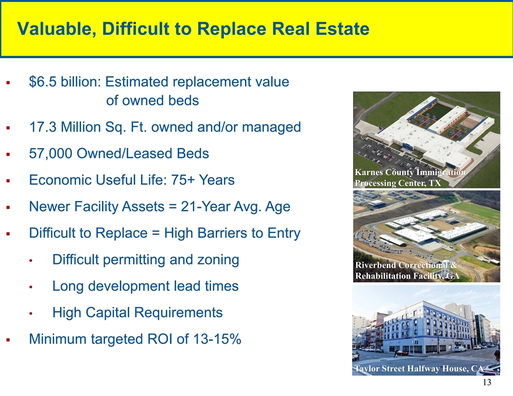 Valuable, Difficult to Replace Real Estate § $6.5 billion: Estimated replacement value of owned beds § 17.3 Million Sq. Ft. owned and/or managed § 57,000 Owned/Leased Beds Karnes County Immigration § Economic Useful Life: 75+ Years Processing Center, TX § Newer Facility Assets = 21-Year Avg. Age § Difficult to Replace = High Barriers to Entry • Difficult permitting and zoning Riverbend Correctional & Rehabilitation Facility, GA • Long development lead times • High Capital Requirements § Minimum targeted ROI of 13-15% Taylor Street Halfway House, CA 13