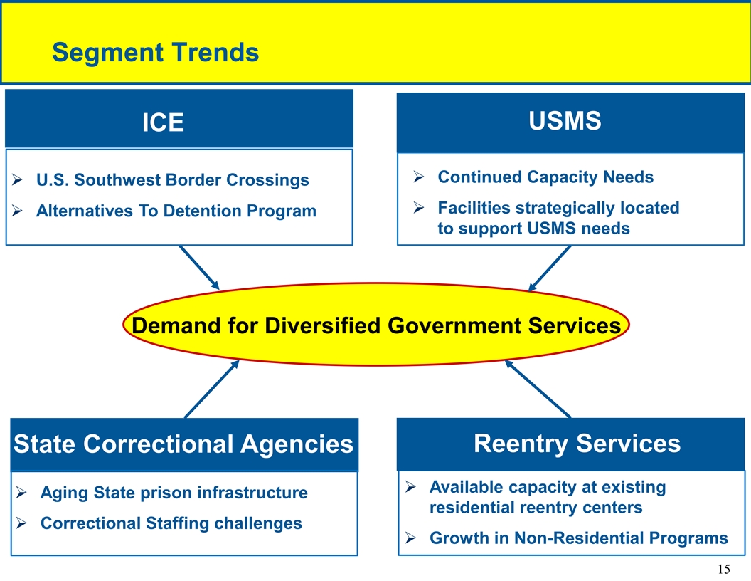 Segment Trends USMS ICE Ø Continued Capacity Needs Ø U.S. Southwest Border Crossings Ø Facilities strategically located Ø Alternatives To Detention Program to support USMS needs Demand for Diversified Government Services Reentry Services State Correctional Agencies Ø Available capacity at existing Ø Aging State prison infrastructure residential reentry centers Ø Correctional Staffing challenges Ø Growth in Non-Residential Programs 15