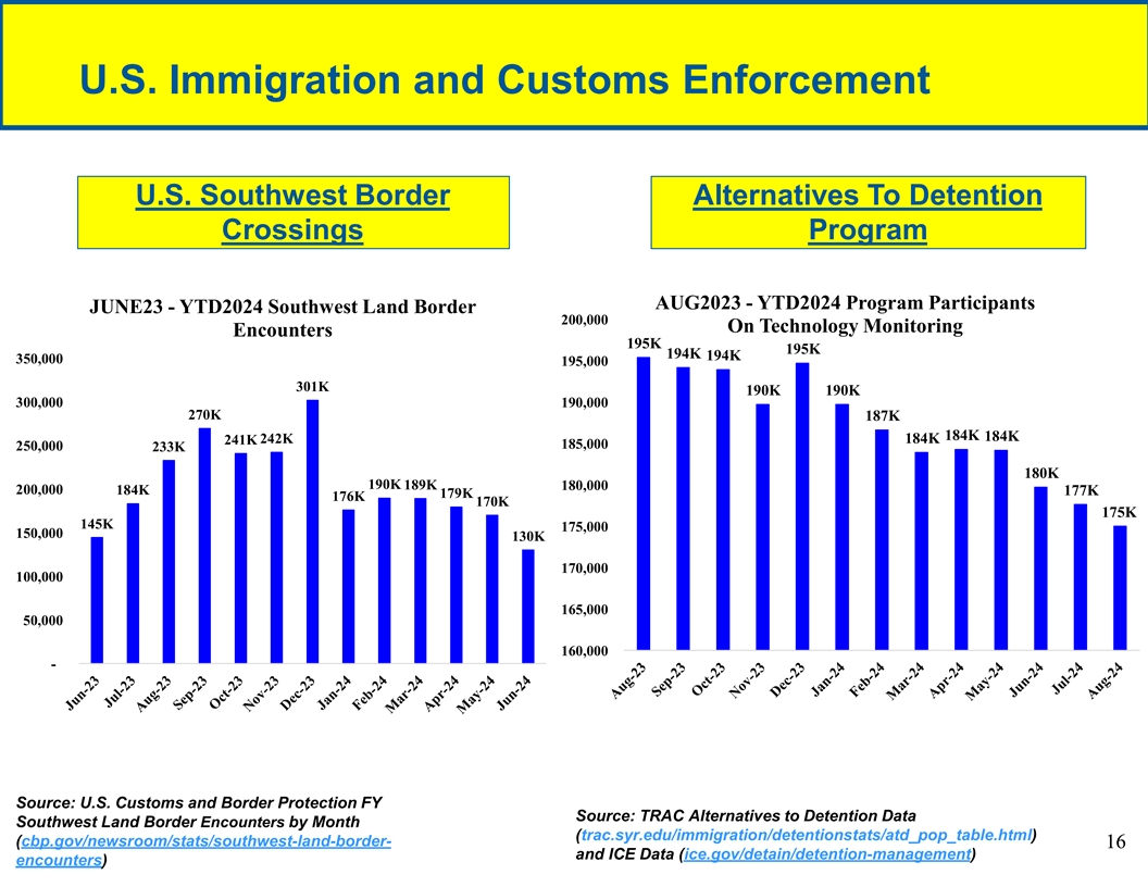 U.S. Immigration and Customs Enforcement FEDERAL SEGMENT U.S. Southwest Border Alternatives To Detention Reentry Crossings Program Services AUG2023 - YTD2024 Program Participants JUNE23 - YTD2024 Southwest Land Border 200,000 On Technology Monitoring Encounters 195K 195K 194K 194K 350,000 195,000 301K 190K 190K 300,000 190,000 270K 187K 184K 184K 242K 184K 241K 185,000 250,000 233K 180K 190K 189K 180,000 200,000 184K 177K 179K 176K 170K 175K 145K 175,000 150,000 130K 170,000 100,000 165,000 50,000 160,000 - Source: U.S. Customs and Border Protection FY Source: TRAC Alternatives to Detention Data Southwest Land Border Encounters by Month (trac.syr.edu/immigration/detentionstats/atd_pop_table.html) (cbp.gov/newsroom/stats/southwest-land-border- 16 and ICE Data (ice.gov/detain/detention-management) encounters)