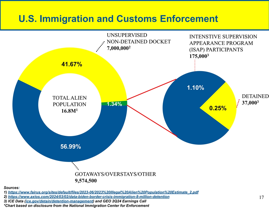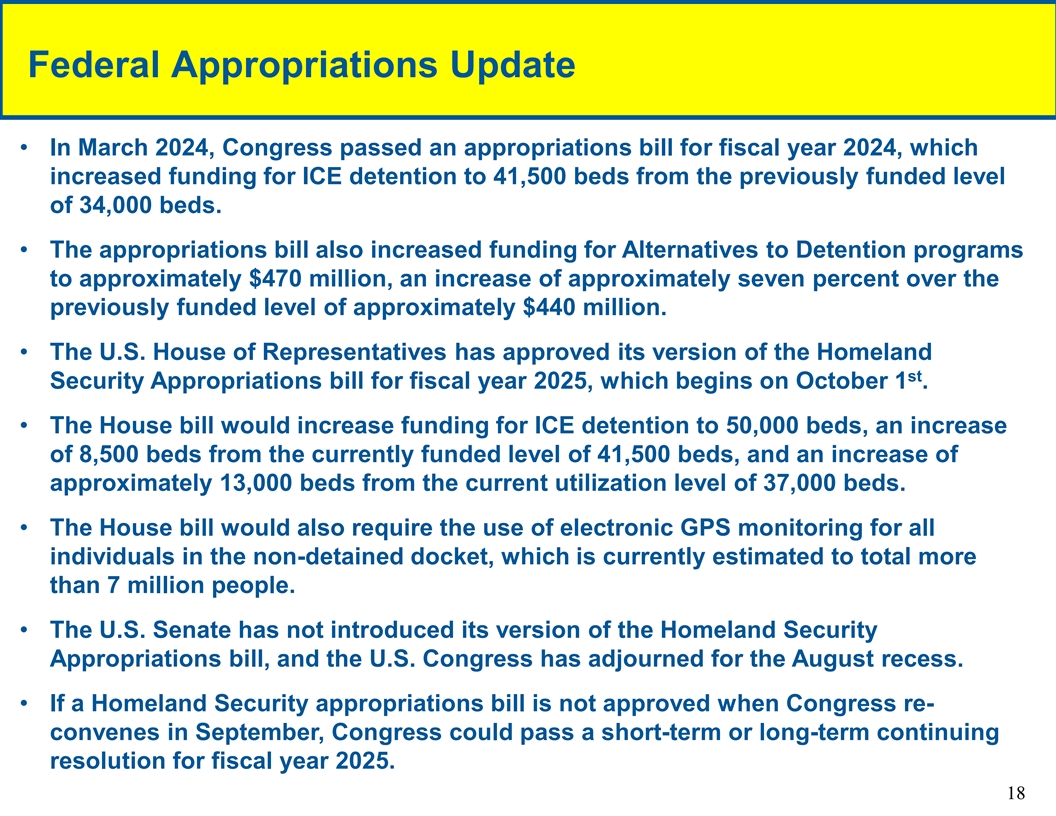 U.S. Immigration and Customs Enforcement UNSUPERVISED INTENSTIVE SUPERVISION NON-DETAINED DOCKET APPEARANCE PROGRAM 2 7,000,000 (ISAP) PARTICIPANTS 3 175,000 41.67% 1.10% 1.34% DETAINED TOTAL ALIEN 3 37,000 POPULATION 1.34% 0.25% 1 16.8M 56.99% GOTAWAYS/OVERSTAYS/OTHER 9,574,500 Sources: 1) https://www.fairus.org/sites/default/files/2023-06/2023%20Illegal%20Alien%20Population%20Estimate_2.pdf 2) https://www.axios.com/2024/03/02/data-biden-border-crisis-immigration-8-million-detention 17 3) ICE Data (ice.gov/detain/detention-management) and GEO 2Q24 Earnings Call *Chart based on disclosure from the National Immigration Center for Enforcement