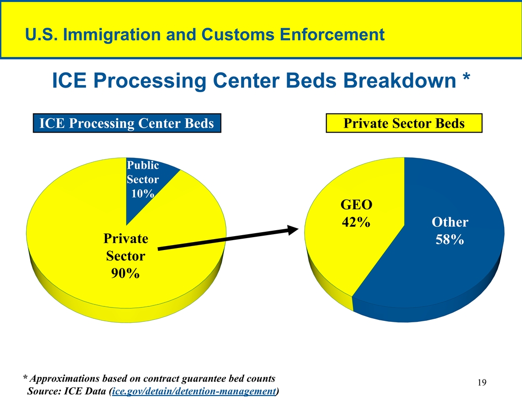 U.S. Immigration and Customs Enforcement ICE Processing Center Beds Breakdown * ICE Processing Center Beds Private Sector Beds Public Sector 10% GEO Other 42% Private 58% Sector 90% * Approximations based on contract guarantee bed counts 19 Source: ICE Data (ice.gov/detain/detention-management)