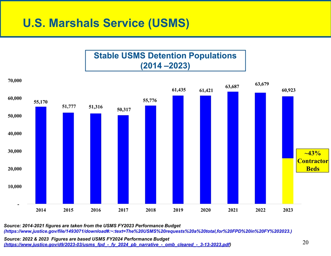 U.S. Marshals Service (USMS) Stable USMS Detention Populations (2014 –2023) 70,000 63,679 63,687 61,435 60,923 61,421 60,000 55,776 55,170 51,777 51,316 50,317 50,000 40,000 30,000 ~43% Contractor 20,000 Beds 10,000 - 2014 2015 2016 2017 2018 2019 2020 2021 2022 2023 Source: 2014-2021 figures are taken from the USMS FY2023 Performance Budget (https://www.justice.gov/file/1493071/download#:~:text=The%20USMS%20requests%20a%20total,for%20FPD%20in%20FY%202023.) Source: 2022 & 2023 Figures are based USMS FY2024 Performance Budget 20 (https://www.justice.gov/d9/2023-03/usms_fpd_-_fy_2024_pb_narrative_-_omb_cleared_-_3-13-2023.pdf)