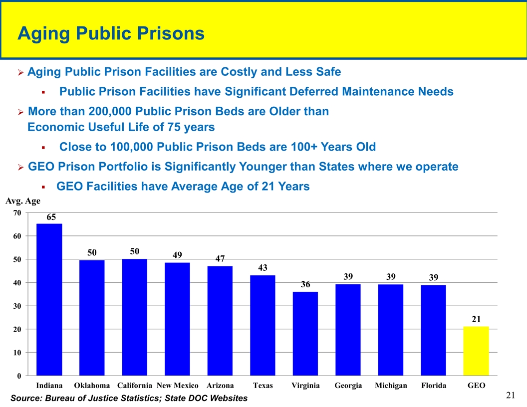 Aging Public Prisons Ø Aging Public Prison Facilities are Costly and Less Safe § Public Prison Facilities have Significant Deferred Maintenance Needs Ø More than 200,000 Public Prison Beds are Older than Economic Useful Life of 75 years § Close to 100,000 Public Prison Beds are 100+ Years Old Ø GEO Prison Portfolio is Significantly Younger than States where we operate § GEO Facilities have Average Age of 21 Years Avg. Age 70 65 60 50 50 49 47 50 43 39 39 39 40 36 30 21 20 10 0 Indiana Oklahoma California New Mexico Arizona Texas Virginia Georgia Michigan Florida GEO 21 Source: Bureau of Justice Statistics; State DOC Websites