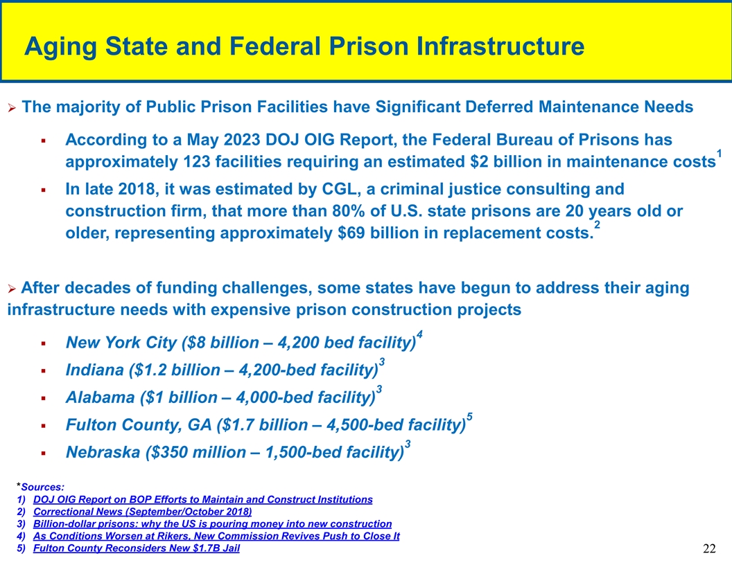 Aging State and Federal Prison Infrastructure Ø The majority of Public Prison Facilities have Significant Deferred Maintenance Needs § According to a May 2023 DOJ OIG Report, the Federal Bureau of Prisons has 1 approximately 123 facilities requiring an estimated $2 billion in maintenance costs § In late 2018, it was estimated by CGL, a criminal justice consulting and construction firm, that more than 80% of U.S. state prisons are 20 years old or 2 older, representing approximately $69 billion in replacement costs. Ø After decades of funding challenges, some states have begun to address their aging infrastructure needs with expensive prison construction projects 4 § New York City ($8 billion – 4,200 bed facility) 3 § Indiana ($1.2 billion – 4,200-bed facility) 3 § Alabama ($1 billion – 4,000-bed facility) 5 § Fulton County, GA ($1.7 billion – 4,500-bed facility) 3 § Nebraska ($350 million – 1,500-bed facility) *Sources: 1) DOJ OIG Report on BOP Efforts to Maintain and Construct Institutions 2) Correctional News (September/October 2018) 3) Billion-dollar prisons: why the US is pouring money into new construction 4) As Conditions Worsen at Rikers, New Commission Revives Push to Close It 5) Fulton County Reconsiders New $1.7B Jail 22