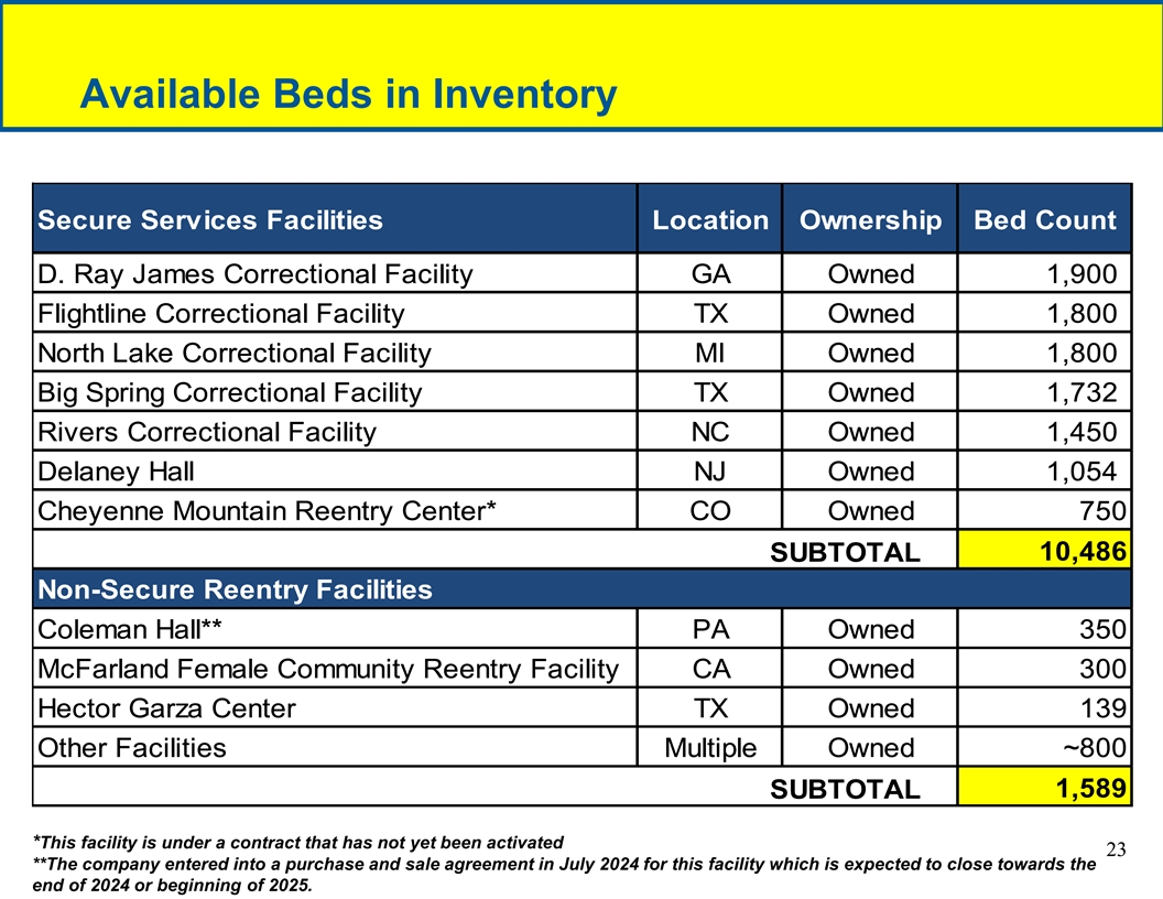 Available Beds in Inventory Secure Services Facilities Location Ownership Bed Count D. Ray James Correctional Facility GA Owned 1,900 Flightline Correctional Facility TX Owned 1,800 North Lake Correctional Facility MI Owned 1,800 Big Spring Correctional Facility TX Owned 1,732 Rivers Correctional Facility NC Owned 1,450 Delaney Hall NJ Owned 1,054 Cheyenne Mountain Reentry Center* CO Owned 750 10,486 SUBTOTAL Non-Secure Reentry Facilities Coleman Hall** PA Owned 350 McFarland Female Community Reentry Facility CA Owned 300 Hector Garza Center TX Owned 139 Other Facilities Multiple Owned ~800 1,589 SUBTOTAL *This facility is under a contract that has not yet been activated 23 **The company entered into a purchase and sale agreement in July 2024 for this facility which is expected to close towards the end of 2024 or beginning of 2025.