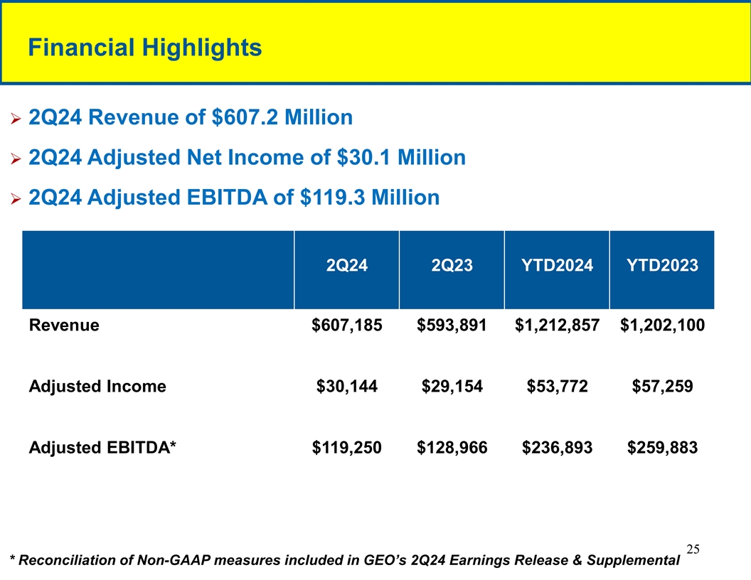 Financial Highlights Ø 2Q24 Revenue of $607.2 Million Ø 2Q24 Adjusted Net Income of $30.1 Million Ø 2Q24 Adjusted EBITDA of $119.3 Million 2Q24 2Q23 YTD2024 YTD2023 Revenue $607,185 $593,891 $1,212,857 $1,202,100 Adjusted Income $30,144 $29,154 $53,772 $57,259 Adjusted EBITDA* $119,250 $128,966 $236,893 $259,883 25 * Reconciliation of Non-GAAP measures included in GEO’s 2Q24 Earnings Release & Supplemental