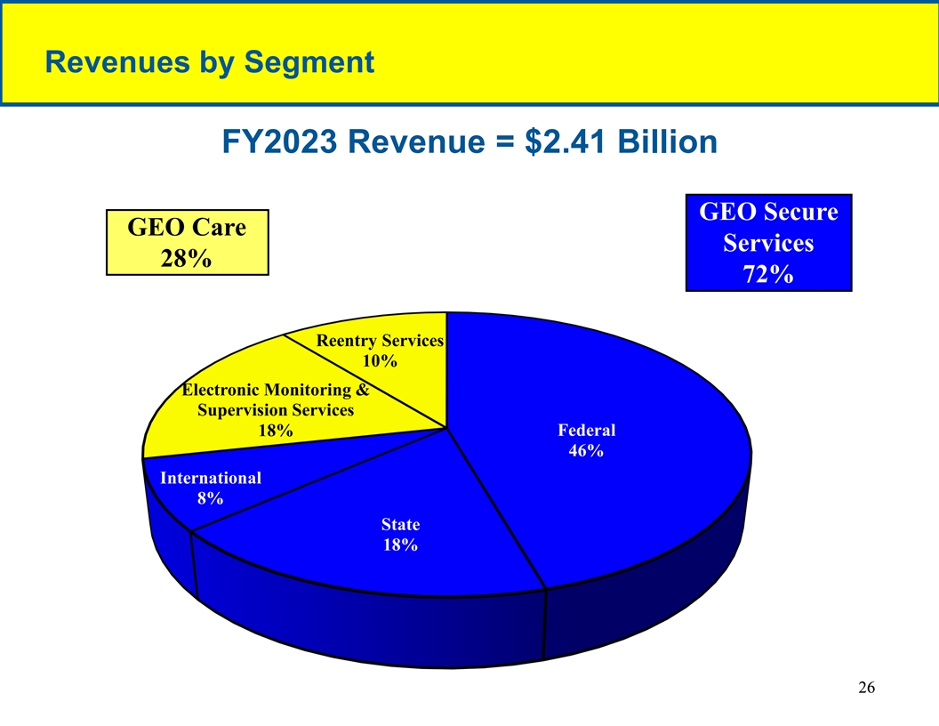 Revenues by Segment FY2023 Revenue = $2.41 Billion GEO Secure GEO Care Services 28% 72% Reentry Services 10% Electronic Monitoring & Supervision Services 18% Federal 46% International 8% State 18% 26