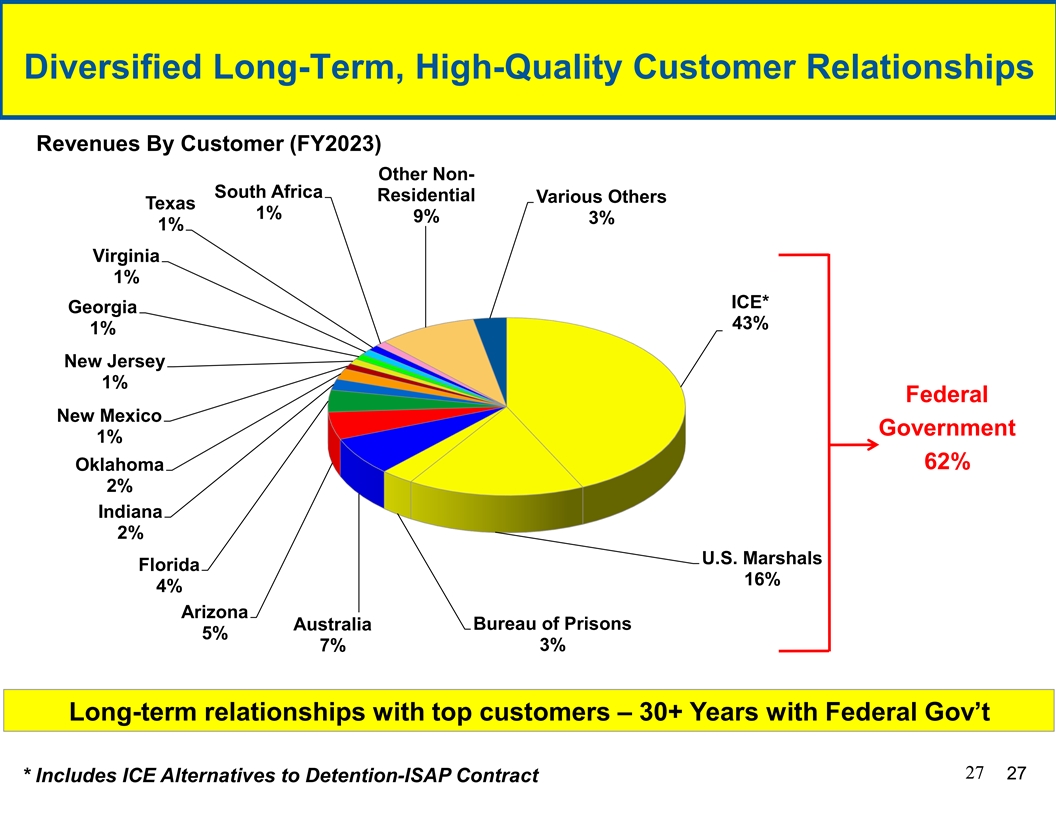 Diversified Long-Term, High-Quality Customer Relationships Revenues By Customer (FY2023) Other Non- South Africa Residential Various Others Texas 1% 9% 3% 1% Virginia 1% ICE* Georgia 43% 1% New Jersey 1% Federal New Mexico Government 1% 62% Oklahoma 2% Indiana 2% U.S. Marshals Florida 16% 4% Arizona Australia Bureau of Prisons 5% 3% 7% Long-term relationships with top customers – 30+ Years with Federal Gov’t 27 27 * Includes ICE Alternatives to Detention-ISAP Contract