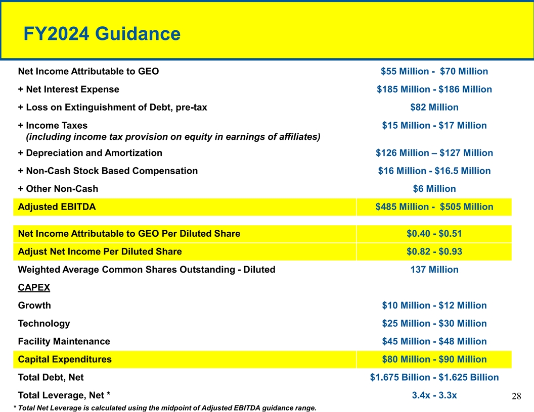 FY2024 Guidance Net Income Attributable to GEO $55 Million - $70 Million + Net Interest Expense $185 Million - $186 Million + Loss on Extinguishment of Debt, pre-tax $82 Million + Income Taxes $15 Million - $17 Million (including income tax provision on equity in earnings of affiliates) + Depreciation and Amortization $126 Million – $127 Million + Non-Cash Stock Based Compensation $16 Million - $16.5 Million + Other Non-Cash $6 Million Adjusted EBITDA $485 Million - $505 Million Net Income Attributable to GEO Per Diluted Share $0.40 - $0.51 Adjust Net Income Per Diluted Share $0.82 - $0.93 Weighted Average Common Shares Outstanding - Diluted 137 Million CAPEX Growth $10 Million - $12 Million Technology $25 Million - $30 Million Facility Maintenance $45 Million - $48 Million Capital Expenditures $80 Million - $90 Million Total Debt, Net $1.675 Billion - $1.625 Billion Total Leverage, Net * 3.4x - 3.3x 28 * Total Net Leverage is calculated using the midpoint of Adjusted EBITDA guidance range.
