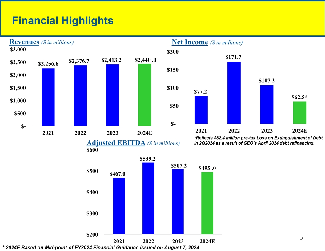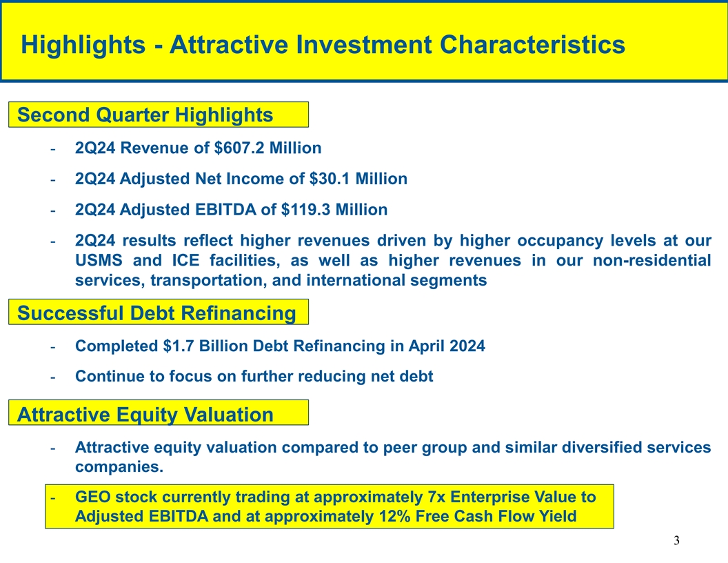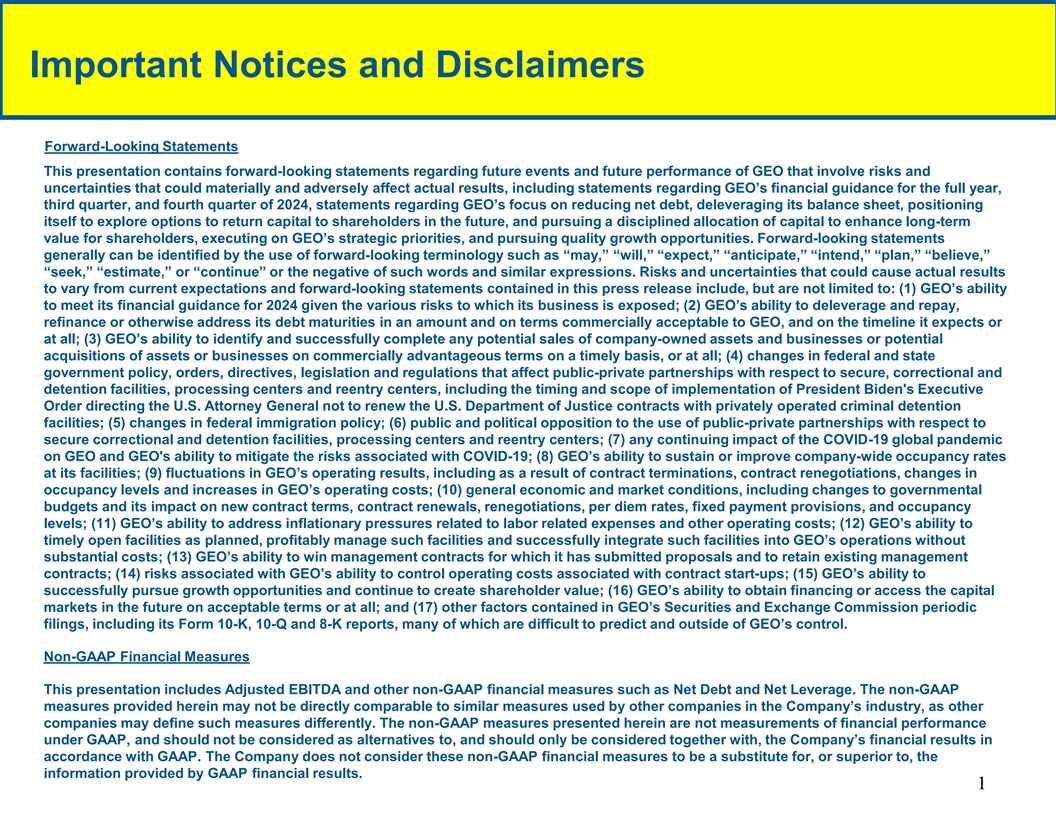 Important Notices and Disclaimers Forward-Looking Statements This presentation contains forward-looking statements regarding future events and future performance of GEO that involve risks and uncertainties that could materially and adversely affect actual results, including statements regarding GEO’s financial guidance for the full year, third quarter, and fourth quarter of 2024, statements regarding GEO’s focus on reducing net debt, deleveraging its balance sheet, positioning itself to explore options to return capital to shareholders in the future, and pursuing a disciplined allocation of capital to enhance long-term value for shareholders, executing on GEO’s strategic priorities, and pursuing quality growth opportunities. Forward-looking statements generally can be identified by the use of forward-looking terminology such as “may,” “will,” “expect,” “anticipate,” “intend,” “plan,” “believe,” “seek,” “estimate,” or “continue” or the negative of such words and similar expressions. Risks and uncertainties that could cause actual results to vary from current expectations and forward-looking statements contained in this press release include, but are not limited to: (1) GEO’s ability to meet its financial guidance for 2024 given the various risks to which its business is exposed; (2) GEO’s ability to deleverage and repay, refinance or otherwise address its debt maturities in an amount and on terms commercially acceptable to GEO, and on the timeline it expects or at all; (3) GEO’s ability to identify and successfully complete any potential sales of company-owned assets and businesses or potential acquisitions of assets or businesses on commercially advantageous terms on a timely basis, or at all; (4) changes in federal and state government policy, orders, directives, legislation and regulations that affect public-private partnerships with respect to secure, correctional and detention facilities, processing centers and reentry centers, including the timing and scope of implementation of President Biden's Executive Order directing the U.S. Attorney General not to renew the U.S. Department of Justice contracts with privately operated criminal detention facilities; (5) changes in federal immigration policy; (6) public and political opposition to the use of public-private partnerships with respect to secure correctional and detention facilities, processing centers and reentry centers; (7) any continuing impact of the COVID-19 global pandemic on GEO and GEO's ability to mitigate the risks associated with COVID-19; (8) GEO’s ability to sustain or improve company-wide occupancy rates at its facilities; (9) fluctuations in GEO’s operating results, including as a result of contract terminations, contract renegotiations, changes in occupancy levels and increases in GEO’s operating costs; (10) general economic and market conditions, including changes to governmental budgets and its impact on new contract terms, contract renewals, renegotiations, per diem rates, fixed payment provisions, and occupancy levels; (11) GEO’s ability to address inflationary pressures related to labor related expenses and other operating costs; (12) GEO’s ability to timely open facilities as planned, profitably manage such facilities and successfully integrate such facilities into GEO’s operations without substantial costs; (13) GEO’s ability to win management contracts for which it has submitted proposals and to retain existing management contracts; (14) risks associated with GEO’s ability to control operating costs associated with contract start-ups; (15) GEO’s ability to successfully pursue growth opportunities and continue to create shareholder value; (16) GEO’s ability to obtain financing or access the capital markets in the future on acceptable terms or at all; and (17) other factors contained in GEO’s Securities and Exchange Commission periodic filings, including its Form 10-K, 10-Q and 8-K reports, many of which are difficult to predict and outside of GEO’s control. Non-GAAP Financial Measures This presentation includes Adjusted EBITDA and other non-GAAP financial measures such as Net Debt and Net Leverage. The non-GAAP measures provided herein may not be directly comparable to similar measures used by other companies in the Company’s industry, as other companies may define such measures differently. The non-GAAP measures presented herein are not measurements of financial performance under GAAP, and should not be considered as alternatives to, and should only be considered together with, the Company’s financial results in accordance with GAAP. The Company does not consider these non-GAAP financial measures to be a substitute for, or superior to, the information provided by GAAP financial results. 1