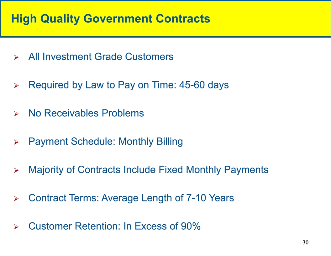 High Quality Government Contracts Ø All Investment Grade Customers Ø Required by Law to Pay on Time: 45-60 days Ø No Receivables Problems Ø Payment Schedule: Monthly Billing Ø Majority of Contracts Include Fixed Monthly Payments Ø Contract Terms: Average Length of 7-10 Years Ø Customer Retention: In Excess of 90% 30