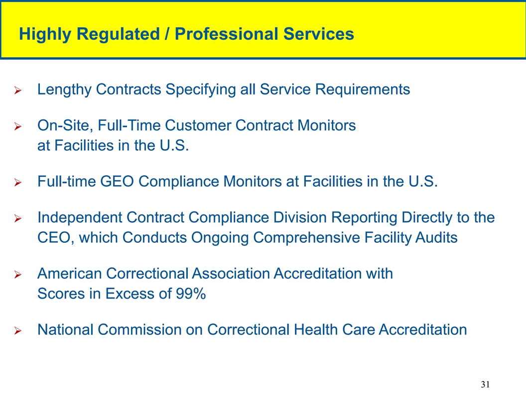 Highly Regulated / Professional Services Ø Lengthy Contracts Specifying all Service Requirements Ø On-Site, Full-Time Customer Contract Monitors at Facilities in the U.S. Ø Full-time GEO Compliance Monitors at Facilities in the U.S. Ø Independent Contract Compliance Division Reporting Directly to the CEO, which Conducts Ongoing Comprehensive Facility Audits Ø American Correctional Association Accreditation with Scores in Excess of 99% Ø National Commission on Correctional Health Care Accreditation 31