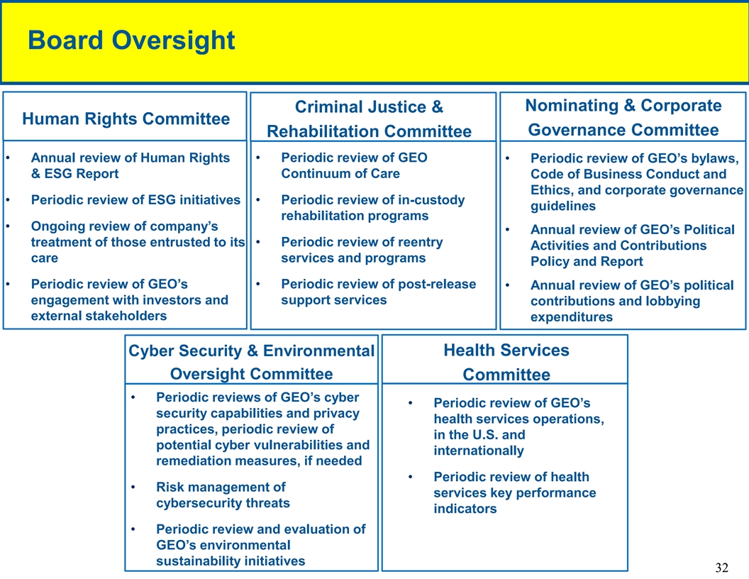 Board Oversight Nominating & Corporate Criminal Justice & Human Rights Committee Governance Committee Rehabilitation Committee • Periodic review of GEO • Annual review of Human Rights • Periodic review of GEO’s bylaws, & ESG Report Continuum of Care Code of Business Conduct and Ethics, and corporate governance • Periodic review of ESG initiatives • Periodic review of in-custody guidelines rehabilitation programs • Ongoing review of company’s • Annual review of GEO’s Political treatment of those entrusted to its • Periodic review of reentry Activities and Contributions care services and programs Policy and Report • Periodic review of GEO’s • Periodic review of post-release • Annual review of GEO’s political engagement with investors and support services contributions and lobbying external stakeholders expenditures Health Services Cyber Security & Environmental Oversight Committee Committee • Periodic reviews of GEO’s cyber • Periodic review of GEO’s security capabilities and privacy health services operations, practices, periodic review of in the U.S. and potential cyber vulnerabilities and internationally remediation measures, if needed • Periodic review of health • Risk management of services key performance cybersecurity threats indicators • Periodic review and evaluation of GEO’s environmental sustainability initiatives 32
