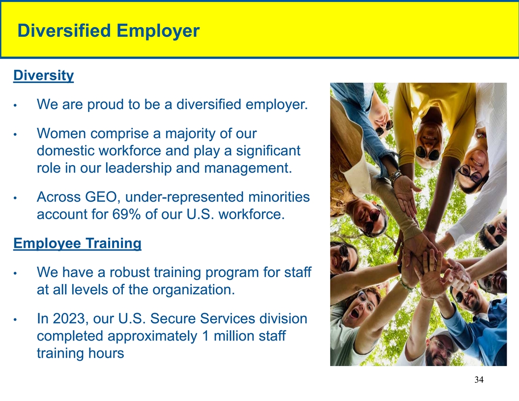 Diversified Employer Diversity • We are proud to be a diversified employer. • Women comprise a majority of our domestic workforce and play a significant role in our leadership and management. • Across GEO, under-represented minorities account for 69% of our U.S. workforce. Employee Training • We have a robust training program for staff at all levels of the organization. • In 2023, our U.S. Secure Services division completed approximately 1 million staff training hours 34