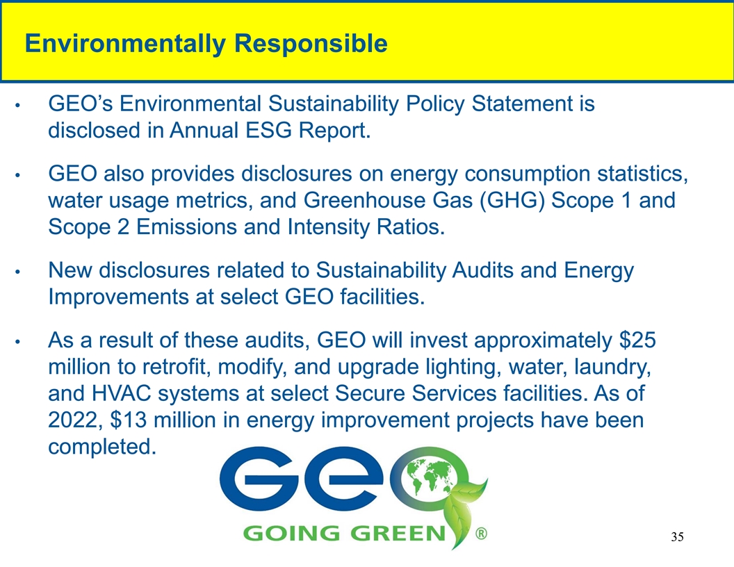 GEO’s ESG Objectives • To implement best practices that follow recognized global Human Rights standards and respect the dignity and basic human rights of all individuals in our care. • To be the leading provider of enhanced in-custody rehabilitation programs and post-release support services through our award-winning GEO Continuum of Care ®. • To provide quality support services that foster a safe and humane environment, deliver high-quality medical care, and adhere to independent accreditation standards. • To provide development opportunities to our workforce and to instill an organizational culture rooted in diversity, inclusion, and respect. • To advance environmental sustainability in our facilities by investing in energy conservation measures and following 33 independent Green Building certification standards.