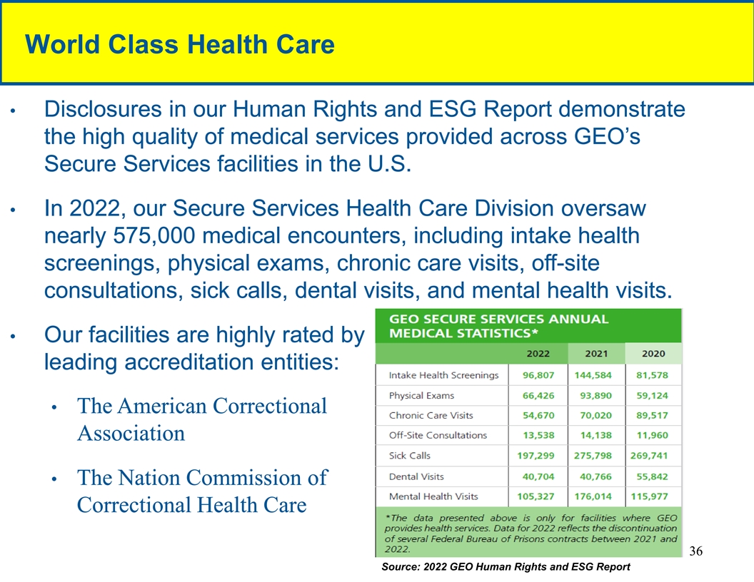 Environmentally Responsible • GEO’s Environmental Sustainability Policy Statement is disclosed in Annual ESG Report. • GEO also provides disclosures on energy consumption statistics, water usage metrics, and Greenhouse Gas (GHG) Scope 1 and Scope 2 Emissions and Intensity Ratios. • New disclosures related to Sustainability Audits and Energy Improvements at select GEO facilities. • As a result of these audits, GEO will invest approximately $25 million to retrofit, modify, and upgrade lighting, water, laundry, and HVAC systems at select Secure Services facilities. As of 2022, $13 million in energy improvement projects have been completed. 35