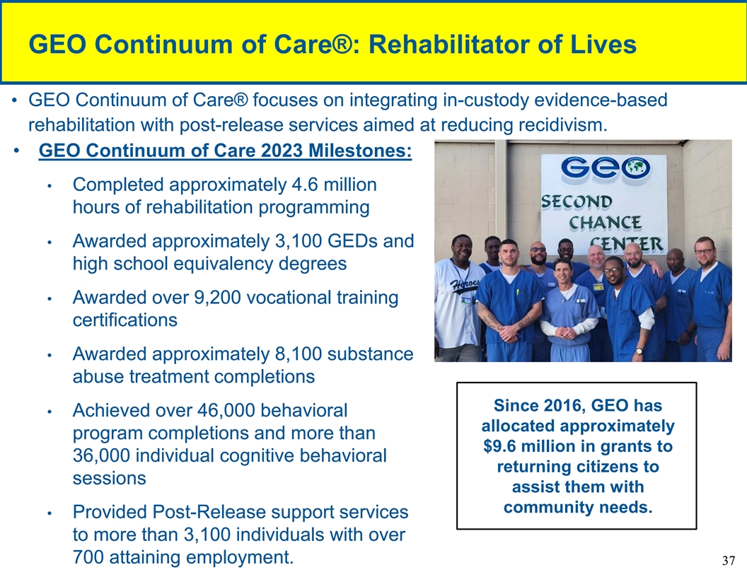 World Class Health Care • Disclosures in our Human Rights and ESG Report demonstrate the high quality of medical services provided across GEO’s Secure Services facilities in the U.S. • In 2022, our Secure Services Health Care Division oversaw nearly 575,000 medical encounters, including intake health screenings, physical exams, chronic care visits, off-site consultations, sick calls, dental visits, and mental health visits. • Our facilities are highly rated by leading accreditation entities: • The American Correctional Association • The Nation Commission of Correctional Health Care 36 Source: 2022 GEO Human Rights and ESG Report