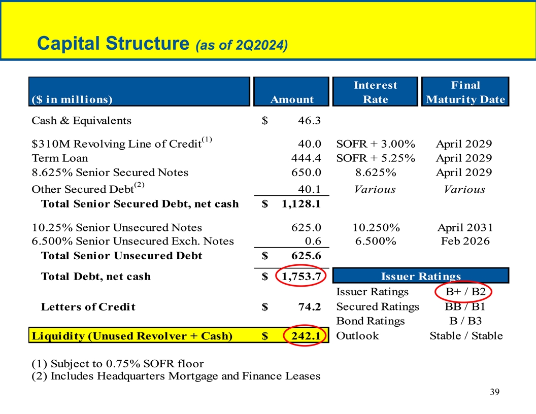 Capital Structure (as of 2Q2024) Interest Final ($ in millions) Amount Rate Maturity Date Cash & Equivalents $ 46.3 (1) $310M Revolving Line of Credit 4 0.0 SOFR + 3.00% April 2029 Term Loan 444.4 SOFR + 5.25% April 2029 8.625% Senior Secured Notes 650.0 8.625% April 2029 (2) Other Secured Debt 40.1 Various Various Total Senior Secured Debt, net cash $ 1,128.1 10.25% Senior Unsecured Notes 625.0 10.250% April 2031 6.500% Senior Unsecured Exch. Notes 0.6 6.500% Feb 2026 Total Senior Unsecured Debt $ 625.6 Total Debt, net cash $ 1,753.7 Issuer Ratings Issuer Ratings B+ / B2 Letters of Credit $ 74.2 Secured Ratings BB / B1 Bond Ratings B / B3 Liquidity (Unused Revolver + Cash) $ 242.1 Outlook Stable / Stable (1) Subject to 0.75% SOFR floor (2) Includes Headquarters Mortgage and Finance Leases 39