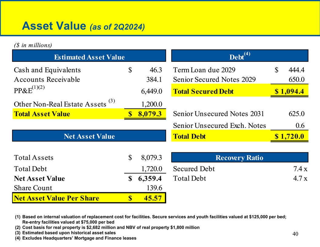 Asset Value (as of 2Q2024) ($ in millions) (4) Estimated Asset Value Debt Cash and Equivalents $ 46.3 Term Loan due 2029 $ 444.4 Accounts Receivable 384.1 Senior Secured Notes 2029 650.0 (1)(2) PP&E 6,449.0 Total Secured Debt $ 1,094.4 (3) Other Non-Real Estate Assets 1,200.0 Total Asset Value $ 8,079.3 Senior Unsecured Notes 2031 625.0 Senior Unsecured Exch. Notes 0.6 Net Asset Value Total Debt $ 1,720.0 Total Assets $ 8,079.3 Recovery Ratio Total Debt 1,720.0 Secured Debt 7.4 x Net Asset Value $ 6,359.4 Total Debt 4.7 x Share Count 139.6 Net Asset Value Per Share $ 45.57 (1) Based on internal valuation of replacement cost for facilities. Secure services and youth facilities valued at $125,000 per bed; Re-entry facilities valued at $75,000 per bed (2) Cost basis for real property is $2,682 million and NBV of real property $1,800 million (3) Estimated based upon historical asset sales 40 (4) Excludes Headquarters’ Mortgage and Finance leases