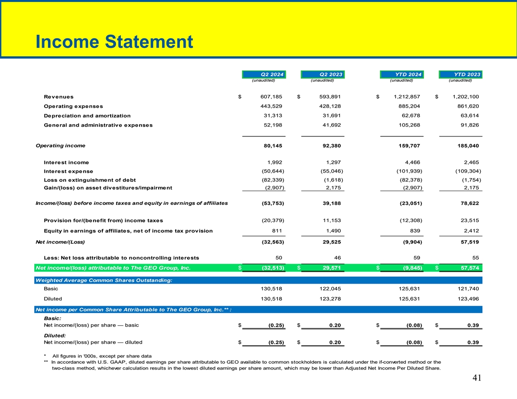 Income Statement Q2 2024 Q2 2023 YTD 2024 YTD 2023 (unaudited) (unaudited) (unaudited) (unaudited) Revenues $ 607,185 $ 593,891 $ 1,212,857 $ 1,202,100 443,529 428,128 885,204 861,620 Operating expenses Depreciation and amortization 31,313 31,691 62,678 63,614 52,198 41,692 105,268 91,826 General and administrative expenses Operating income 80,145 92,380 159,707 185,040 Interest income 1,992 1,297 4,466 2,465 Interest expense (50,644) (55,046) (101,939) (109,304) Loss on extinguishment of debt (82,339) (1,618) (82,378) (1,754) Gain/(loss) on asset divestitures/impairment (2,907) 2,175 (2,907) 2,175 Income/(loss) before income taxes and equity in earnings of affiliates (53,753) 39,188 (23,051) 78,622 Provision for/(benefit from) income taxes (20,379) 11,153 (12,308) 23,515 Equity in earnings of affiliates, net of income tax provision 811 1,490 839 2,412 Net income/(Loss) (32,563) 29,525 (9,904) 57,519 Less: Net loss attributable to noncontrolling interests 5 0 46 59 55 Net income/(loss) attributable to The GEO Group, Inc. $ (32,513) $ 29,571 $ (9,845) $ 57,574 Weighted Average Common Shares Outstanding: Basic 130,518 122,045 125,631 121,740 Diluted 130,518 123,278 125,631 123,496 Net income per Common Share Attributable to The GEO Group, Inc.** : Basic: Net income/(loss) per share — basic $ $ $ $ (0.25) 0.20 (0.08) 0.39 Diluted: Net income/(loss) per share — diluted $ (0.25) $ 0.20 $ (0.08) $ 0.39 * All figures in '000s, except per share data ** In accordance with U.S. GAAP, diluted earnings per share attributable to GEO available to common stockholders is calculated under the if-converted method or the two-class method, whichever calculation results in the lowest diluted earnings per share amount, which may be lower than Adjusted Net Income Per Diluted Share. 41