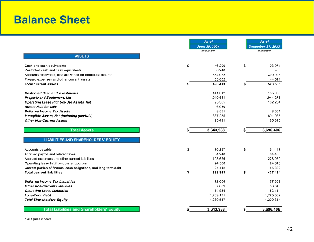 Balance Sheet As of As of June 30, 2024 December 31, 2023 (unaudited) (unaudited) ASSETS Cash and cash equivalents $ 46,299 $ 93,971 Restricted cash and cash equivalents 6,240 - Accounts receivable, less allowance for doubtful accounts 384,072 390,023 Prepaid expenses and other current assets 53,802 44,511 $ Total current assets 490,413 $ 528,505 Restricted Cash and Investments 141,312 135,968 Property and Equipment, Net 1,919,541 1,944,278 Operating Lease Right-of-Use Assets, Net 95,365 102,204 Assets Held for Sale 6,080 - 8,551 8,551 Deferred Income Tax Assets Intangible Assets, Net (including goodwill) 887,235 891,085 95,491 85,815 Other Non-Current Assets Total Assets $ 3,643,988 $ 3,696,406 LIABILITIES AND SHAREHOLDERS' EQUITY Accounts payable $ 76,287 $ 64,447 Accrued payroll and related taxes 64,940 64,436 Accrued expenses and other current liabilities 198,626 228,059 Operating lease liabilities, current portion 24,568 24,640 Current portion of finance lease obligations, and long-term debt 24,442 55,882 Total current liabilities $ 388,863 $ 437,464 Deferred Income Tax Liabilities 72,604 77,369 Other Non-Current Liabilities 87,869 83,643 Operating Lease Liabilities 74,924 82,114 Long-Term Debt 1,739,191 1,725,502 Total Shareholders' Equity 1,280,537 1,290,314 Total Liabilities and Shareholders' Equity $ 3,643,988 $ 3,696,406 * all figures in '000s 42