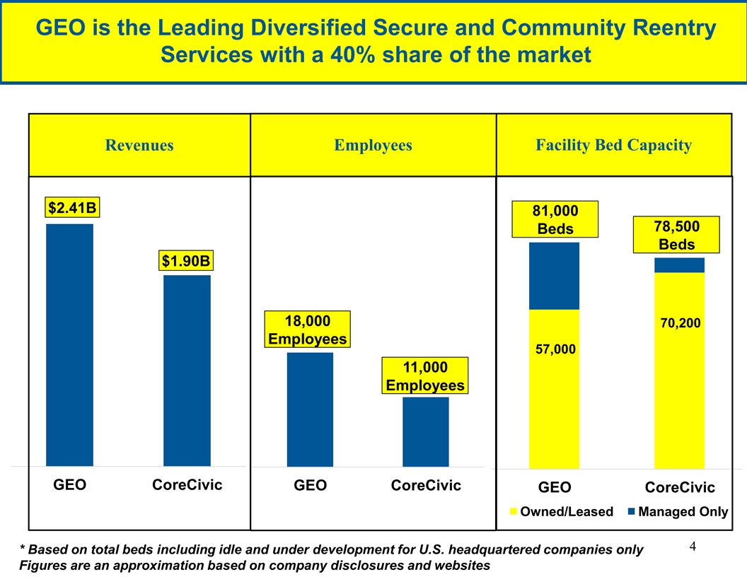 Highlights - Attractive Investment Characteristics Second Quarter Highlights - 2Q24 Revenue of $607.2 Million - 2Q24 Adjusted Net Income of $30.1 Million - 2Q24 Adjusted EBITDA of $119.3 Million - 2Q24 results reflect higher revenues driven by higher occupancy levels at our USMS and ICE facilities, as well as higher revenues in our non-residential services, transportation, and international segments Successful Debt Refinancing - Completed $1.7 Billion Debt Refinancing in April 2024 - Continue to focus on further reducing net debt Attractive Equity Valuation - Attractive equity valuation compared to peer group and similar diversified services companies. - GEO stock currently trading at approximately 7x Enterprise Value to Adjusted EBITDA and at approximately 12% Free Cash Flow Yield 3