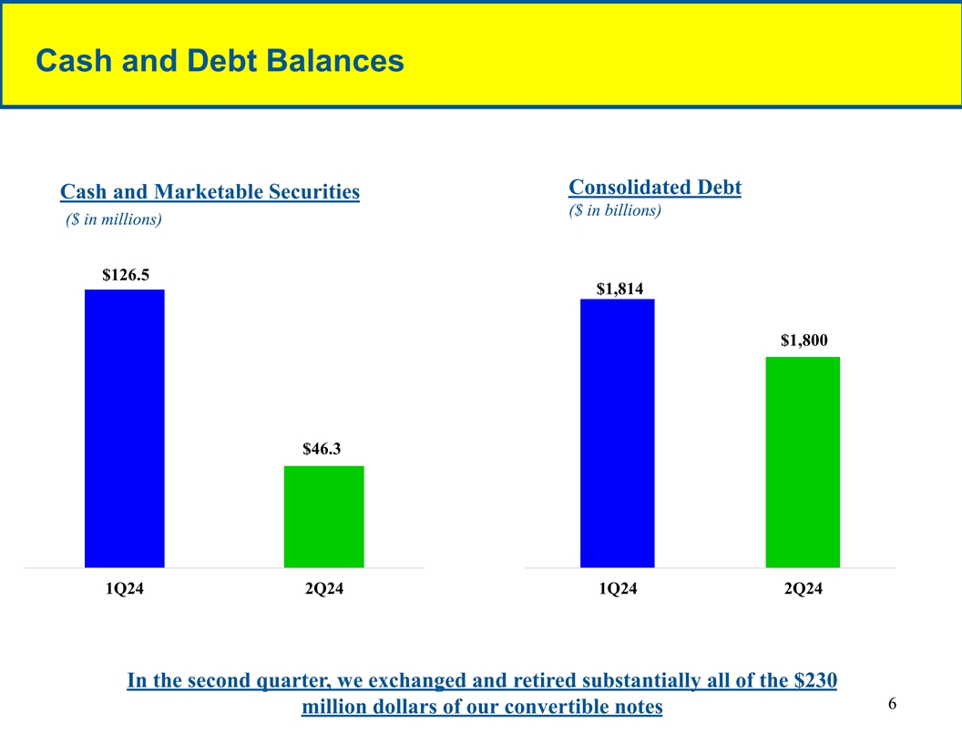 Cash and Debt Balances Consolidated Debt Cash and Marketable Securities ($ in billions) ($ in millions) $126.5 $1,814 $1,800 $46.3 1Q24 2Q24 1Q24 2Q24 In the second quarter, we exchanged and retired substantially all of the $230 6 million dollars of our convertible notes