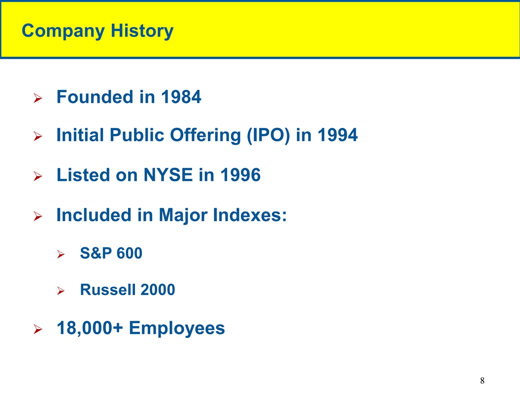 Company History Ø Founded in 1984 Ø Initial Public Offering (IPO) in 1994 Ø Listed on NYSE in 1996 Ø Included in Major Indexes: Ø S&P 600 Ø Russell 2000 Ø 18,000+ Employees 8