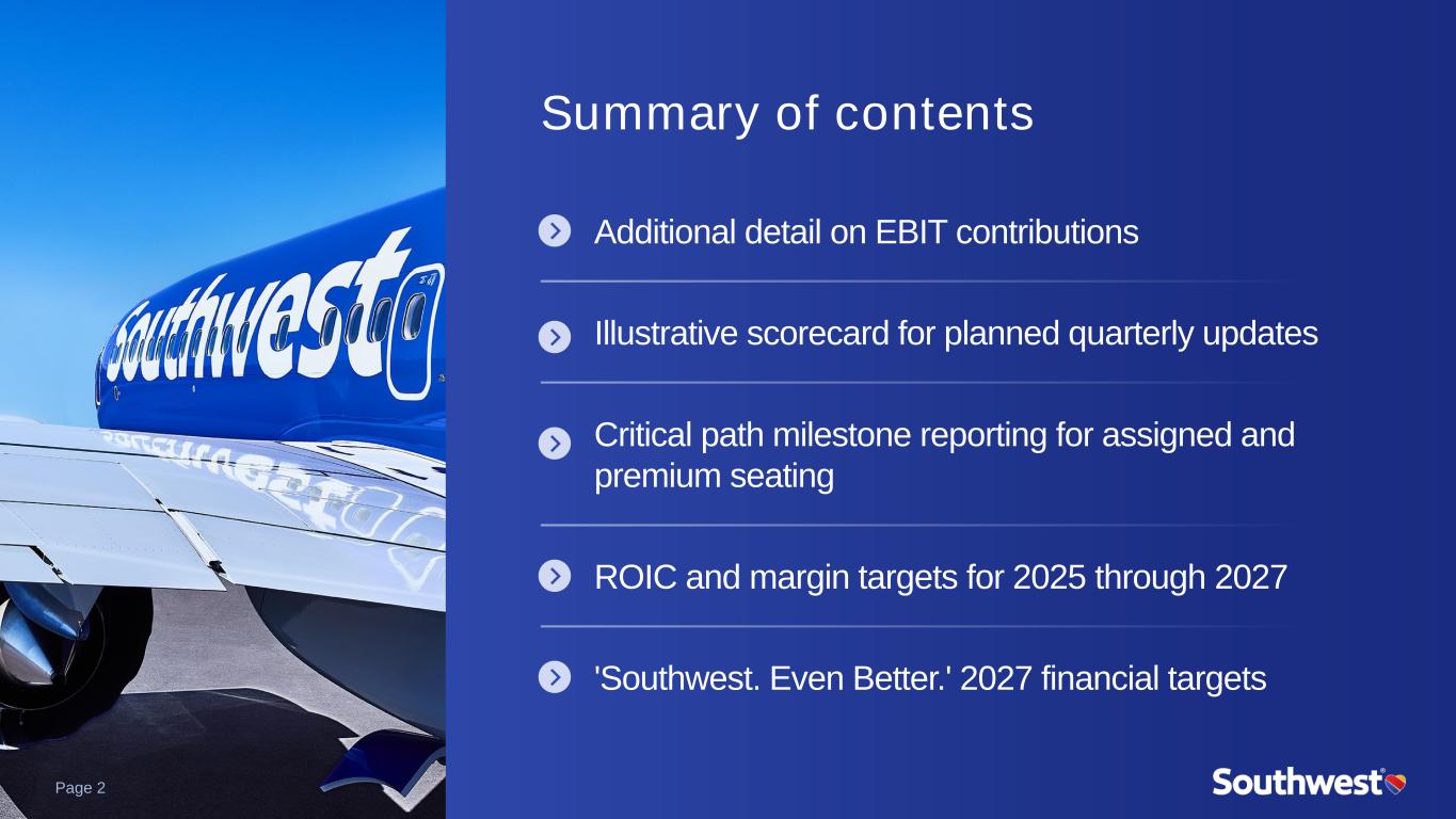 Summary of contents Additional detail on EBIT contributions Illustrative scorecard for planned quarterly updates Critical path milestone reporting for assigned and premium seating ROIC and margin targets for 2025 through 2027 'Southwest. Even Better.' 2027 financial targets Page 2