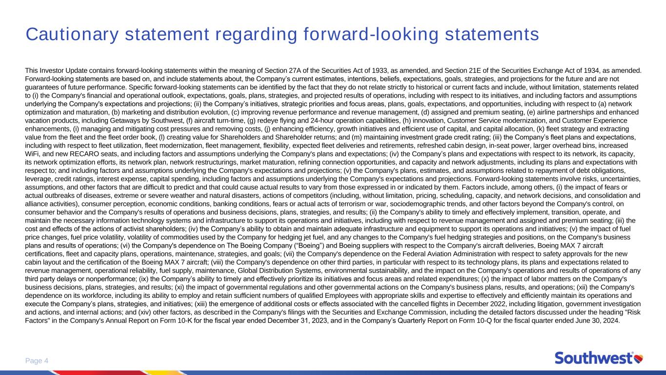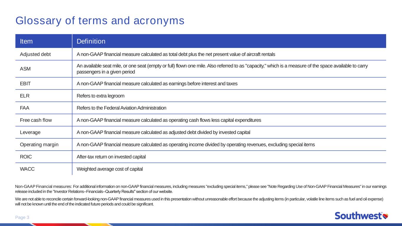Page 3 Glossary of terms and acronyms Item Definition Adjusted debt A non-GAAP financial measure calculated as total debt plus the net present value of aircraft rentals ASM An available seat mile, or one seat (empty or full) flown one mile. Also referred to as "capacity," which is a measure of the space available to carry passengers in a given period EBIT A non-GAAP financial measure calculated as earnings before interest and taxes ELR Refers to extra legroom FAA Refers to the Federal Aviation Administration Free cash flow A non-GAAP financial measure calculated as operating cash flows less capital expenditures Leverage A non-GAAP financial measure calculated as adjusted debt divided by invested capital Operating margin A non-GAAP financial measure calculated as operating income divided by operating revenues, excluding special items ROIC After-tax return on invested capital WACC Weighted average cost of capital Non-GAAP Financial measures: For additional information on non-GAAP financial measures, including measures "excluding special items," please see "Note Regarding Use of Non-GAAP Financial Measures" in our earnings release included in the "Investor Relations--Financials--Quarterly Results" section of our website. ​ We are not able to reconcile certain forward-looking non-GAAP financial measures used in this presentation without unreasonable effort because the adjusting items (in particular, volatile line items such as fuel and oil expense) will not be known until the end of the indicated future periods and could be significant.