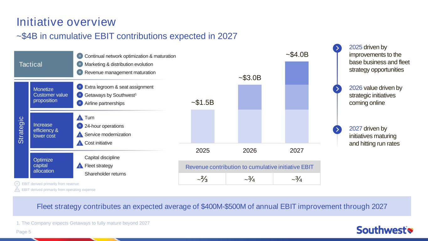 Page 4 Cautionary statement regarding forward-looking statements This Investor Update contains forward-looking statements within the meaning of Section 27A of the Securities Act of 1933, as amended, and Section 21E of the Securities Exchange Act of 1934, as amended. Forward-looking statements are based on, and include statements about, the Company’s current estimates, intentions, beliefs, expectations, goals, strategies, and projections for the future and are not guarantees of future performance. Specific forward-looking statements can be identified by the fact that they do not relate strictly to historical or current facts and include, without limitation, statements related to (i) the Company's financial and operational outlook, expectations, goals, plans, strategies, and projected results of operations, including with respect to its initiatives, and including factors and assumptions underlying the Company's expectations and projections; (ii) the Company’s initiatives, strategic priorities and focus areas, plans, goals, expectations, and opportunities, including with respect to (a) network optimization and maturation, (b) marketing and distribution evolution, (c) improving revenue performance and revenue management, (d) assigned and premium seating, (e) airline partnerships and enhanced vacation products, including Getaways by Southwest, (f) aircraft turn-time, (g) redeye flying and 24-hour operation capabilities, (h) innovation, Customer Service modernization, and Customer Experience enhancements, (i) managing and mitigating cost pressures and removing costs, (j) enhancing efficiency, growth initiatives and efficient use of capital, and capital allocation, (k) fleet strategy and extracting value from the fleet and the fleet order book, (l) creating value for Shareholders and Shareholder returns; and (m) maintaining investment grade credit rating; (iii) the Company’s fleet plans and expectations, including with respect to fleet utilization, fleet modernization, fleet management, flexibility, expected fleet deliveries and retirements, refreshed cabin design, in-seat power, larger overhead bins, increased WiFi, and new RECARO seats, and including factors and assumptions underlying the Company's plans and expectations; (iv) the Company’s plans and expectations with respect to its network, its capacity, its network optimization efforts, its network plan, network restructurings, market maturation, refining connection opportunities, and capacity and network adjustments, including its plans and expectations with respect to; and including factors and assumptions underlying the Company's expectations and projections; (v) the Company's plans, estimates, and assumptions related to repayment of debt obligations, leverage, credit ratings, interest expense, capital spending, including factors and assumptions underlying the Company's expectations and projections. Forward-looking statements involve risks, uncertainties, assumptions, and other factors that are difficult to predict and that could cause actual results to vary from those expressed in or indicated by them. Factors include, among others, (i) the impact of fears or actual outbreaks of diseases, extreme or severe weather and natural disasters, actions of competitors (including, without limitation, pricing, scheduling, capacity, and network decisions, and consolidation and alliance activities), consumer perception, economic conditions, banking conditions, fears or actual acts of terrorism or war, sociodemographic trends, and other factors beyond the Company's control, on consumer behavior and the Company's results of operations and business decisions, plans, strategies, and results; (ii) the Company's ability to timely and effectively implement, transition, operate, and maintain the necessary information technology systems and infrastructure to support its operations and initiatives, including with respect to revenue management and assigned and premium seating; (iii) the cost and effects of the actions of activist shareholders; (iv) the Company’s ability to obtain and maintain adequate infrastructure and equipment to support its operations and initiatives; (v) the impact of fuel price changes, fuel price volatility, volatility of commodities used by the Company for hedging jet fuel, and any changes to the Company's fuel hedging strategies and positions, on the Company's business plans and results of operations; (vi) the Company's dependence on The Boeing Company (“Boeing”) and Boeing suppliers with respect to the Company's aircraft deliveries, Boeing MAX 7 aircraft certifications, fleet and capacity plans, operations, maintenance, strategies, and goals; (vii) the Company's dependence on the Federal Aviation Administration with respect to safety approvals for the new cabin layout and the certification of the Boeing MAX 7 aircraft; (viii) the Company's dependence on other third parties, in particular with respect to its technology plans, its plans and expectations related to revenue management, operational reliability, fuel supply, maintenance, Global Distribution Systems, environmental sustainability, and the impact on the Company's operations and results of operations of any third party delays or nonperformance; (ix) the Company’s ability to timely and effectively prioritize its initiatives and focus areas and related expenditures; (x) the impact of labor matters on the Company's business decisions, plans, strategies, and results; (xi) the impact of governmental regulations and other governmental actions on the Company's business plans, results, and operations; (xii) the Company's dependence on its workforce, including its ability to employ and retain sufficient numbers of qualified Employees with appropriate skills and expertise to effectively and efficiently maintain its operations and execute the Company’s plans, strategies, and initiatives; (xiii) the emergence of additional costs or effects associated with the cancelled f