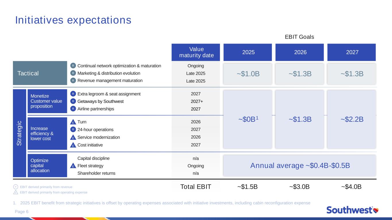 Page 5 Initiative overview ~$4B in cumulative EBIT contributions expected in 2027 1. The Company expects Getaways to fully mature beyond 2027 Monetize Customer value proposition Optimize capital allocation Increase efficiency & lower cost Tactical S tr a te g ic Continual network optimization & maturationR Marketing & distribution evolutionR Revenue management maturationR Extra legroom & seat assignmentR Getaways by Southwest1R Airline partnershipsR Capital discipline Fleet strategy Shareholder returns E Turn 24-hour operationsR Fleet strategy contributes an expected average of $400M-$500M of annual EBIT improvement through 2027 2025 2026 2027 Revenue contribution to cumulative initiative EBIT ~⅔ ~¾ ~¾ ~$1.5B ~$3.0B ~$4.0B 2025 driven by improvements to the base business and fleet strategy opportunities 2026 value driven by strategic initiatives coming online 2027 driven by initiatives maturing and hitting run rates E Service modernization E Cost initiative E EBIT derived primarily from revenue EBIT derived primarily from operating expenseE R