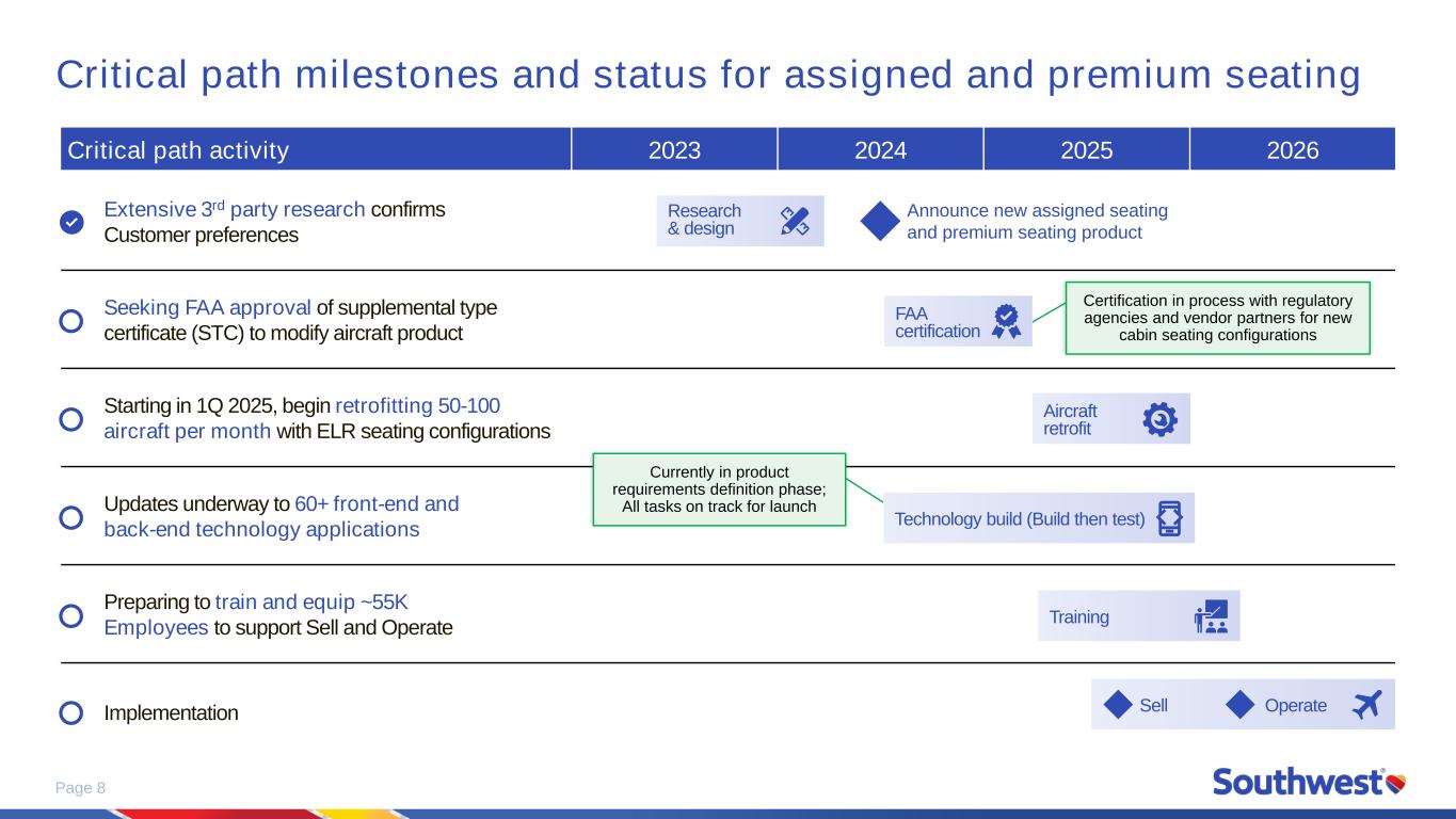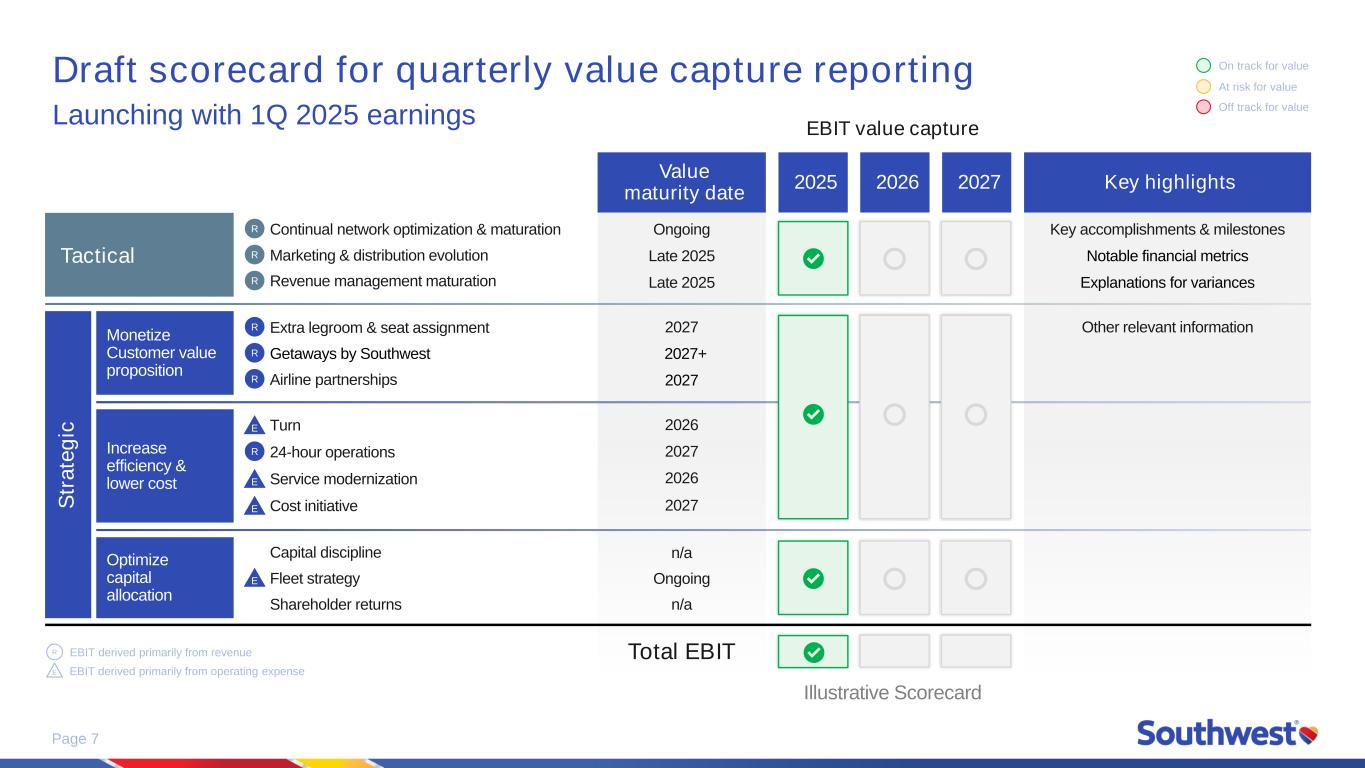 Page 7 Draft scorecard for quarterly value capture reporting Launching with 1Q 2025 earnings Key highlights Key accomplishments & milestones Notable financial metrics Explanations for variances Other relevant information Value maturity date Ongoing Late 2025 Late 2025 2027 2027+ 2027 2026 2027 2026 2027 n/a Ongoing n/a Total EBIT 2025 2026 2027 Monetize Customer value proposition Optimize capital allocation Increase efficiency & lower cost Tactical S tr a te g ic Continual network optimization & maturationR Marketing & distribution evolutionR Revenue management maturationR Extra legroom & seat assignmentR Getaways by SouthwestR Airline partnershipsR Capital discipline Fleet strategy Shareholder returns E Turn 24-hour operationsR E Service modernization E Cost initiative E EBIT derived primarily from revenue EBIT derived primarily from operating expenseE R EBIT value capture On track for value At risk for value Off track for value Illustrative Scorecard
