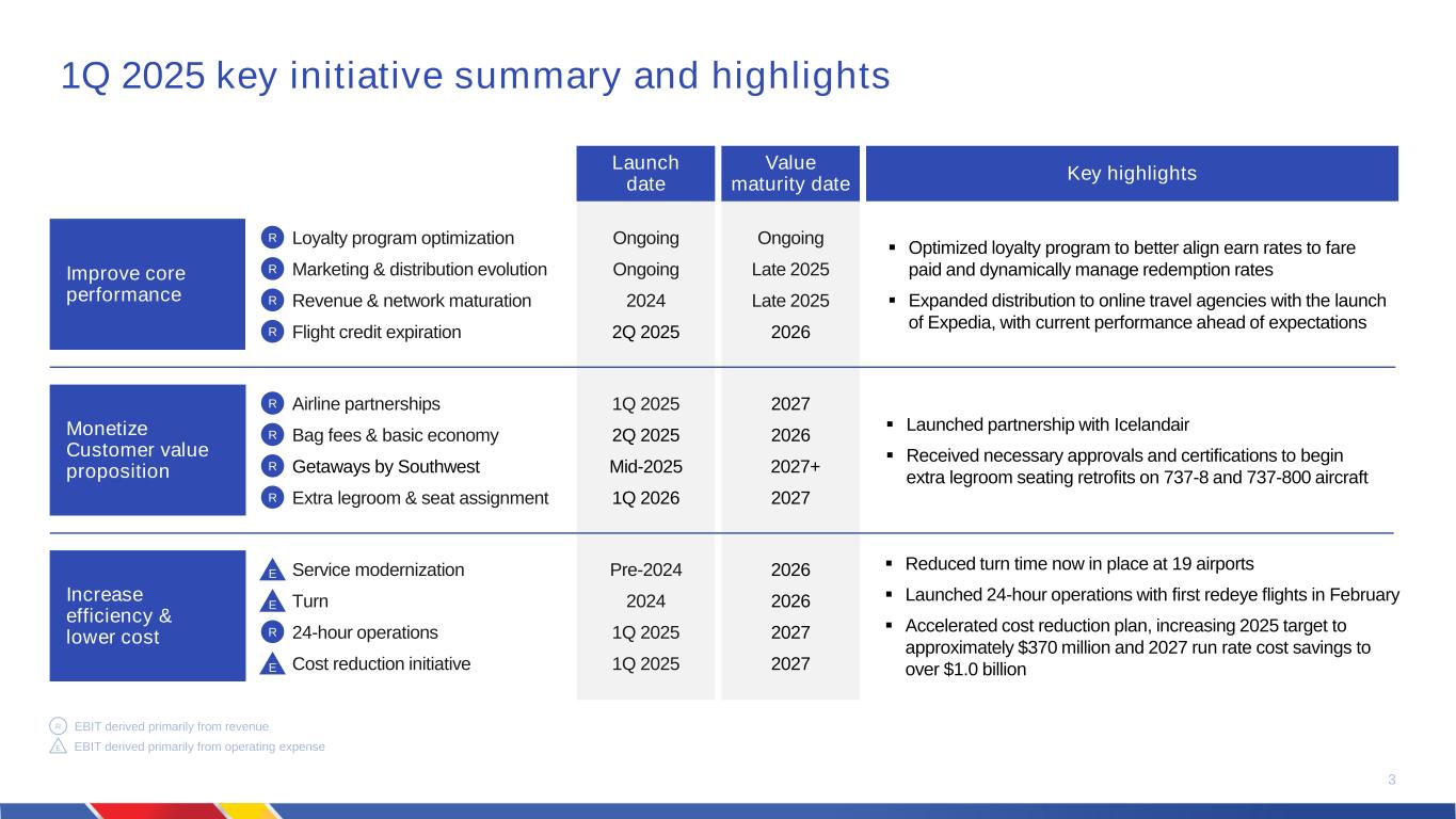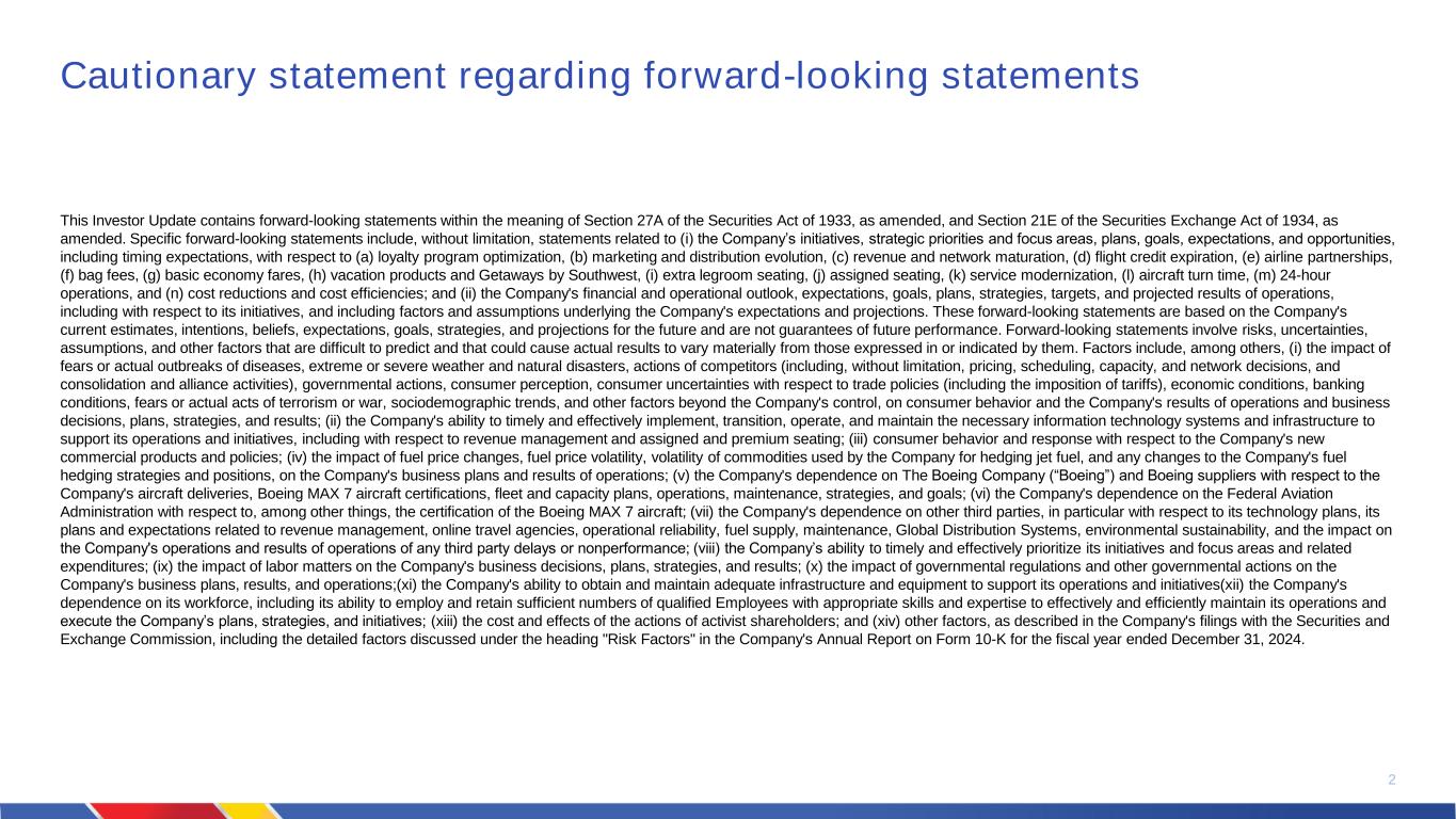 2 Cautionary statement regarding forward-looking statements This Investor Update contains forward-looking statements within the meaning of Section 27A of the Securities Act of 1933, as amended, and Section 21E of the Securities Exchange Act of 1934, as amended. Specific forward-looking statements include, without limitation, statements related to (i) the Company’s initiatives, strategic priorities and focus areas, plans, goals, expectations, and opportunities, including timing expectations, with respect to (a) loyalty program optimization, (b) marketing and distribution evolution, (c) revenue and network maturation, (d) flight credit expiration, (e) airline partnerships, (f) bag fees, (g) basic economy fares, (h) vacation products and Getaways by Southwest, (i) extra legroom seating, (j) assigned seating, (k) service modernization, (l) aircraft turn time, (m) 24-hour operations, and (n) cost reductions and cost efficiencies; and (ii) the Company's financial and operational outlook, expectations, goals, plans, strategies, targets, and projected results of operations, including with respect to its initiatives, and including factors and assumptions underlying the Company's expectations and projections. These forward-looking statements are based on the Company's current estimates, intentions, beliefs, expectations, goals, strategies, and projections for the future and are not guarantees of future performance. Forward-looking statements involve risks, uncertainties, assumptions, and other factors that are difficult to predict and that could cause actual results to vary materially from those expressed in or indicated by them. Factors include, among others, (i) the impact of fears or actual outbreaks of diseases, extreme or severe weather and natural disasters, actions of competitors (including, without limitation, pricing, scheduling, capacity, and network decisions, and consolidation and alliance activities), governmental actions, consumer perception, consumer uncertainties with respect to trade policies (including the imposition of tariffs), economic conditions, banking conditions, fears or actual acts of terrorism or war, sociodemographic trends, and other factors beyond the Company's control, on consumer behavior and the Company's results of operations and business decisions, plans, strategies, and results; (ii) the Company's ability to timely and effectively implement, transition, operate, and maintain the necessary information technology systems and infrastructure to support its operations and initiatives, including with respect to revenue management and assigned and premium seating; (iii) consumer behavior and response with respect to the Company's new commercial products and policies; (iv) the impact of fuel price changes, fuel price volatility, volatility of commodities used by the Company for hedging jet fuel, and any changes to the Company's fuel hedging strategies and positions, on the Company's business plans and results of operations; (v) the Company's dependence on The Boeing Company (“Boeing”) and Boeing suppliers with respect to the Company's aircraft deliveries, Boeing MAX 7 aircraft certifications, fleet and capacity plans, operations, maintenance, strategies, and goals; (vi) the Company's dependence on the Federal Aviation Administration with respect to, among other things, the certification of the Boeing MAX 7 aircraft; (vii) the Company's dependence on other third parties, in particular with respect to its technology plans, its plans and expectations related to revenue management, online travel agencies, operational reliability, fuel supply, maintenance, Global Distribution Systems, environmental sustainability, and the impact on the Company's operations and results of operations of any third party delays or nonperformance; (viii) the Company’s ability to timely and effectively prioritize its initiatives and focus areas and related expenditures; (ix) the impact of labor matters on the Company's business decisions, plans, strategies, and results; (x) the impact of governmental regulations and other governmental actions on the Company's business plans, results, and operations;(xi) the Company's ability to obtain and maintain adequate infrastructure and equipment to support its operations and initiatives(xii) the Company's dependence on its workforce, including its ability to employ and retain sufficient numbers of qualified Employees with appropriate skills and expertise to effectively and efficiently maintain its operations and execute the Company’s plans, strategies, and initiatives; (xiii) the cost and effects of the actions of activist shareholders; and (xiv) other factors, as described in the Company's filings with the Securities and Exchange Commission, including the detailed factors discussed under the heading "Risk Factors" in the Company's Annual Report on Form 10-K for the fiscal year ended December 31, 2024.