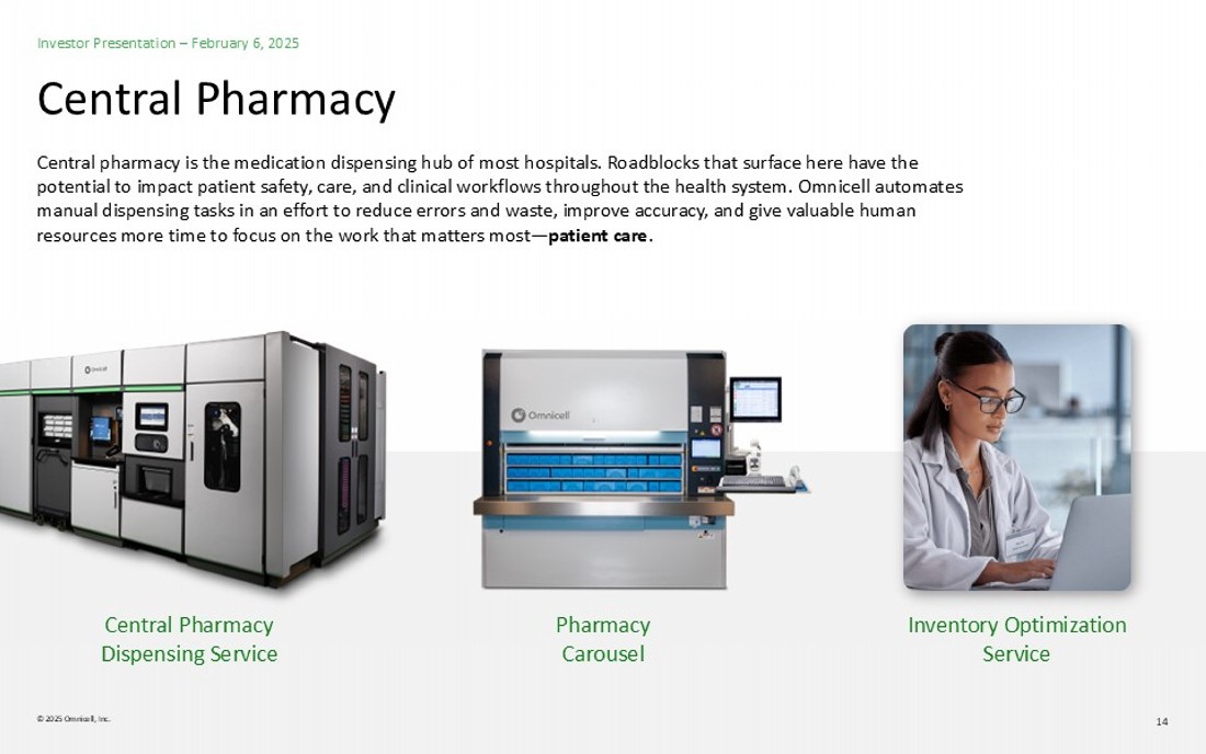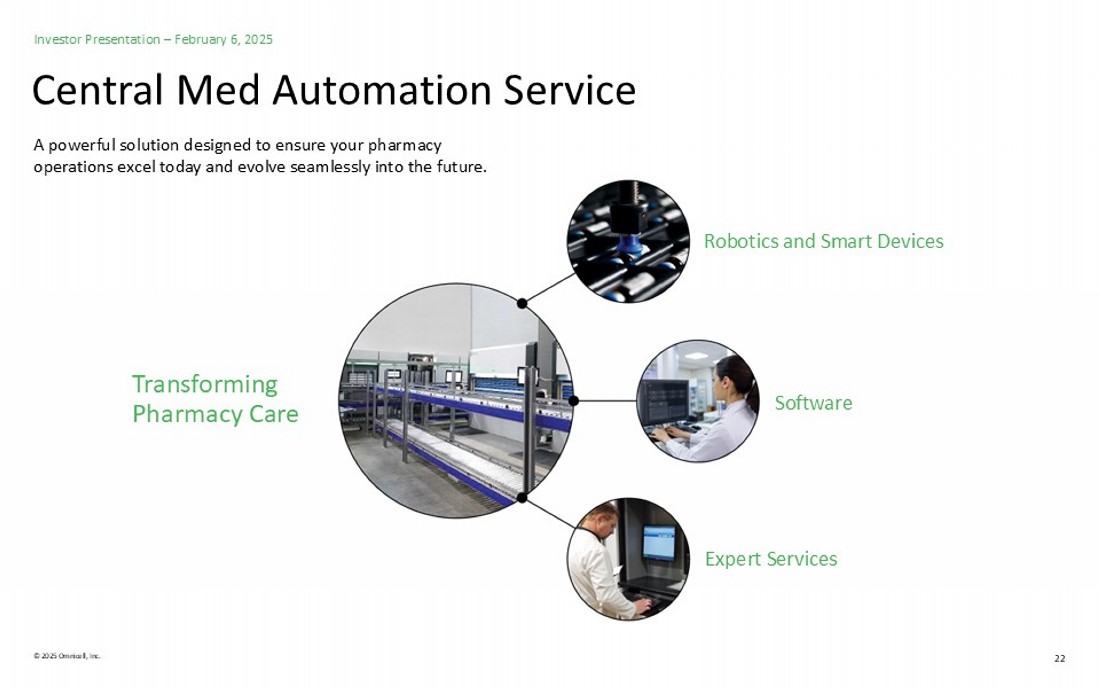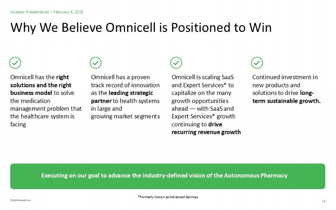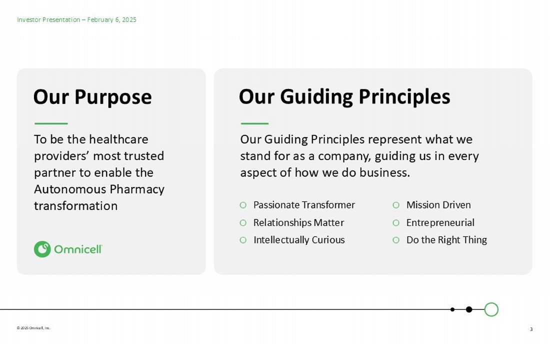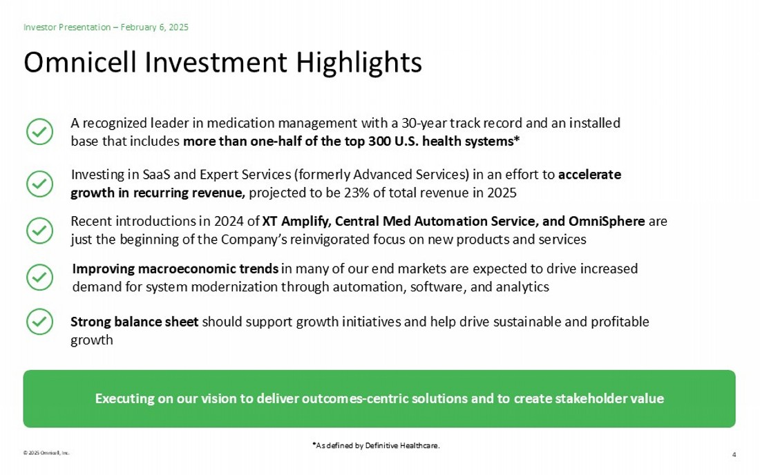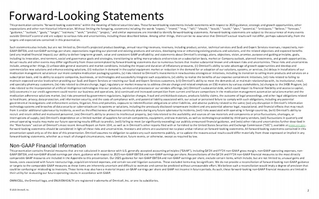 This presentation contains “forward - looking statements” within the meaning of federal securities laws. These forward - looking sta tements include statements with respect to 2025 guidance, strategic and growth opportunities, other expectations and other non - historical information. Without limiting the foregoing, statements including the words “expect,” “intend,” “may,” “will,” “should,” “would,” “could,” “p lan,” “potential,” “anticipate,” “believe,” “forecast,” “guidance,” “outlook,” “goals,” “target,” “estimate,” “seek,” “predict,” “project,” and similar expressions are intended to i den tify forward - looking statements. Forward - looking statements are subject to the occurrence of many events outside Omnicell’s control and are subject to various risks and uncertainties, including those described below. Among other t hin gs, there can be no assurance that Omnicell’s actual results will not differ, perhaps substantially, from the targets and expectations contained in this presentation. Such statements also include, but are not limited to, Omnicell’s projected product bookings, annual recurring revenues, reven ues , including product, service, technical services and SaaS and Expert Services revenues, respectively, non - GAAP EBITDA, and non - GAAP earnings per share; expectations regarding our planned and existing products and services, developing new or enhancing existing products and solutions, and the related objectives and expected benefits (and any implied financial impact); our ability to deliver long - term growth, value and consistent GAAP profitability; and statem ents about Omnicell’s strategy, plans, objectives, vision, promise, purpose and guiding principles, goals, including its innovation, environment, social and governance goals and strategies, transitioning to selling more products and se rvices on a subscription basis, market or Company outlook, planned investments, and growth opportunities. Actual results and other events may differ significantly from those contemplated by forward - looking statements due to numerous f actors that involve substantial known and unknown risks and uncertainties. These risks and uncertainties include, among other things, ( i ) unfavorable general economic and market conditions, including the impact and duration of inflationary pressures, (ii) Omnic ell ’s ability to take advantage of growth opportunities and develop and commercialize new solutions and enhance existing solutions, (iii) reduction in demand in the capital equipment market or redu cti on in the demand for or adoption of our solutions, systems, or services, (iv) delays in installations of our medication management solutions or our more complex medication packaging systems, (v) risks related to Omnicell’s investments in new business strategies or initiatives, including its transition to selling more products and services on a subscription basis, and its ability to acquire companies, businesses, or technologies and successfully integrate such acquisi tio ns, (vi) ability to realize the benefits of our expense containment initiatives, (vii) risks related to failing to maintain expected service levels when providing our SaaS and Expert Services or retaining our SaaS and Expert Services custom ers , (viii) Omnicell’s ability to meet the demands of, or maintain relationships with, its institutional, retail, and specialty pharmacy customers, (ix) risks related to climate change, legal, regulatory or market measures to address clima te change and related emphasis on ESG matters by various stakeholders, (x) changes to the 340B Program, (xi) risks related to the incorporation of artificial intelligence technologies into our products, services and processes or our v end ors offerings, (xii) Omnicell’s substantial debt, which could impair its financial flexibility and access to capital, (xiii) covenants in our credit agreement could restrict our business and operations, (xiv) continued and increased competitio n f rom current and future competitors in the medication management automation solutions market and the medication adherence solutions market, (xv) risks presented by government regulations, legislative changes, fraud and anti - kickb ack statues, products liability claims, the outcome of legal proceedings, and other legal obligations related to healthcare, privacy, data protection, and information security, and the costs of compliance with, and potential liability ass ociated with, our actual or perceived failure to comply with such obligations, including any potential governmental investigations and enforcement actions, litigation, fines and penalties, exposure to indemnification obligations or other liabilities, and adverse publicity related to the same; (xvi) any disruption in Omnicell’s information technology systems and breaches of data security or cyber - attacks on its systems or solutions, including the previously disclose d ransomware incident and any potential adverse legal, reputational, and financial effects that may result from it and/or additional cybersecurity incidents, as well as the effectiveness of business continuity plans during any futur e c ybersecurity incidents, (xvii) risks associated with operating in foreign countries, (xviii) Omnicell’s ability to recruit and retain skilled and motivated personnel, (xix) Omnicell’s ability to protect its intellectual property, (xx) risks re lated to the availability and sources of raw materials and components or price fluctuations, shortages, or interruptions of supply, (xxi) Omnicell’s dependence on a limited number of suppliers for certain components, equipment, and raw materials, as well as technologies provided by third - party vendors, (xxii) fluctuations in quarterly and annual operating results may make our future operating results difficult to predict, (xxiii) failing to meet (or significantl y e xceedi