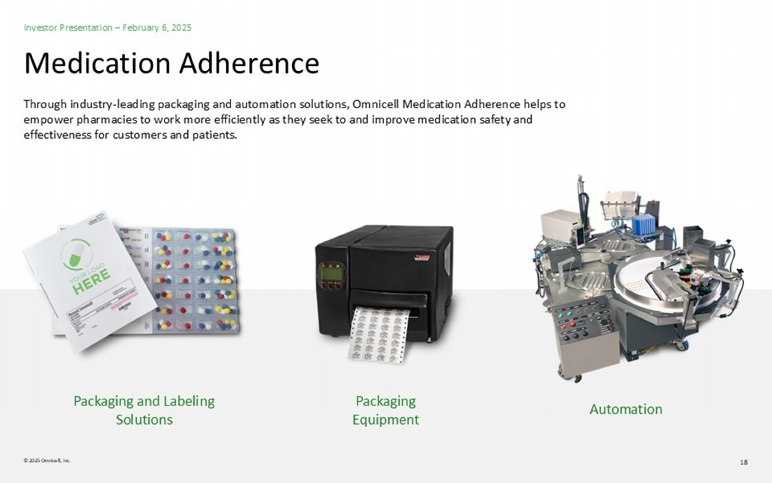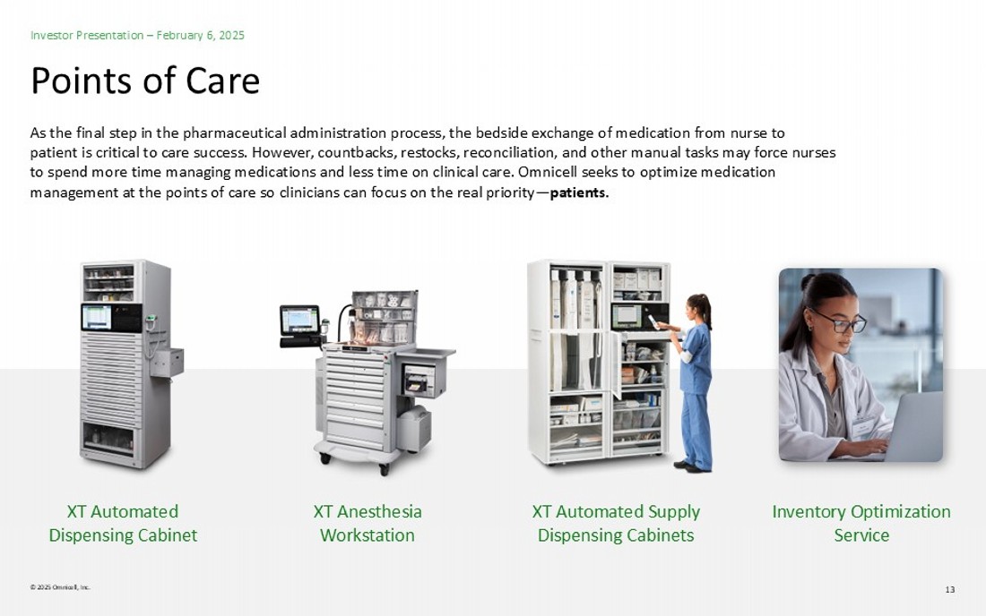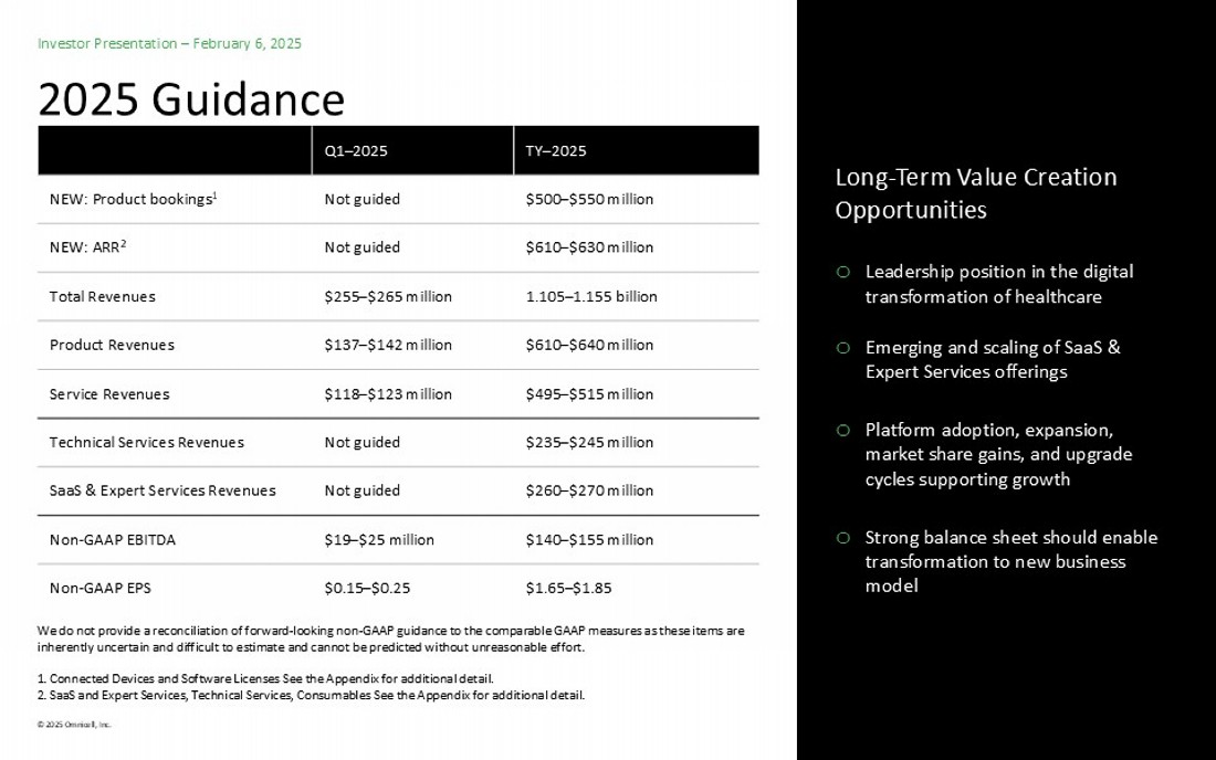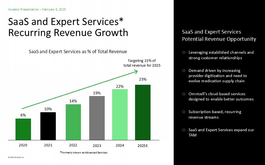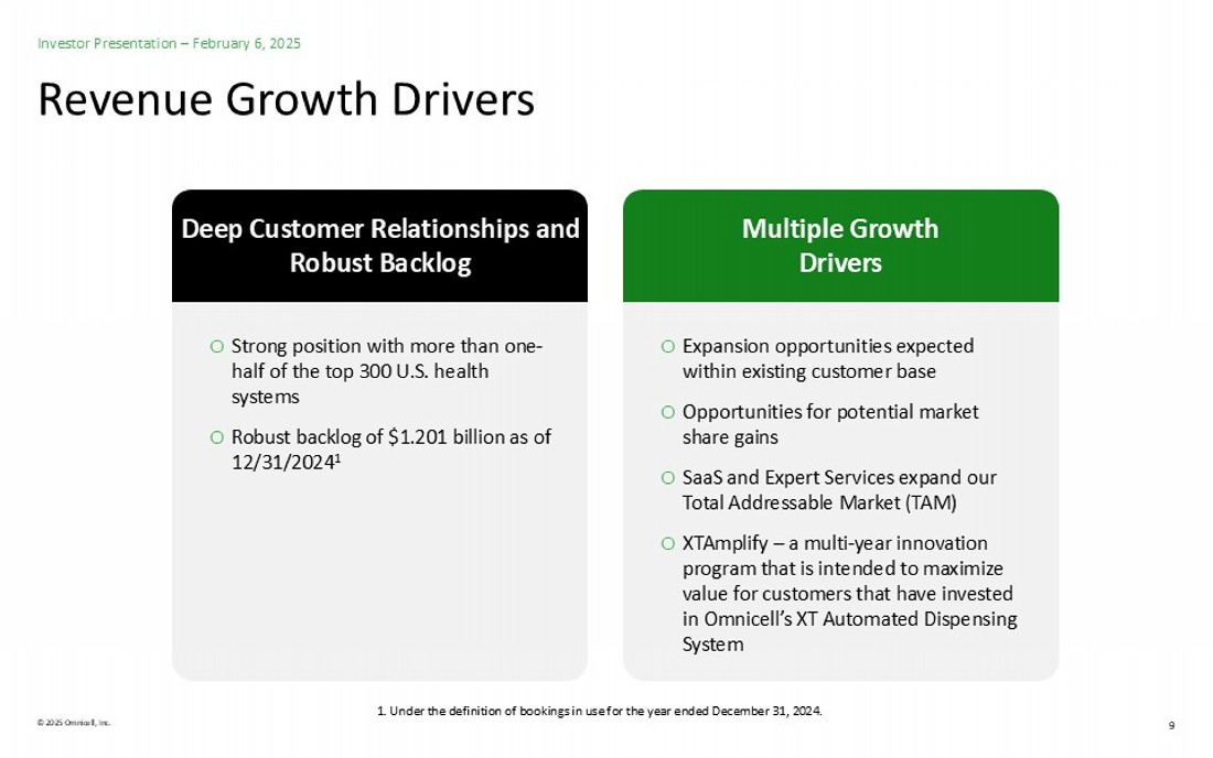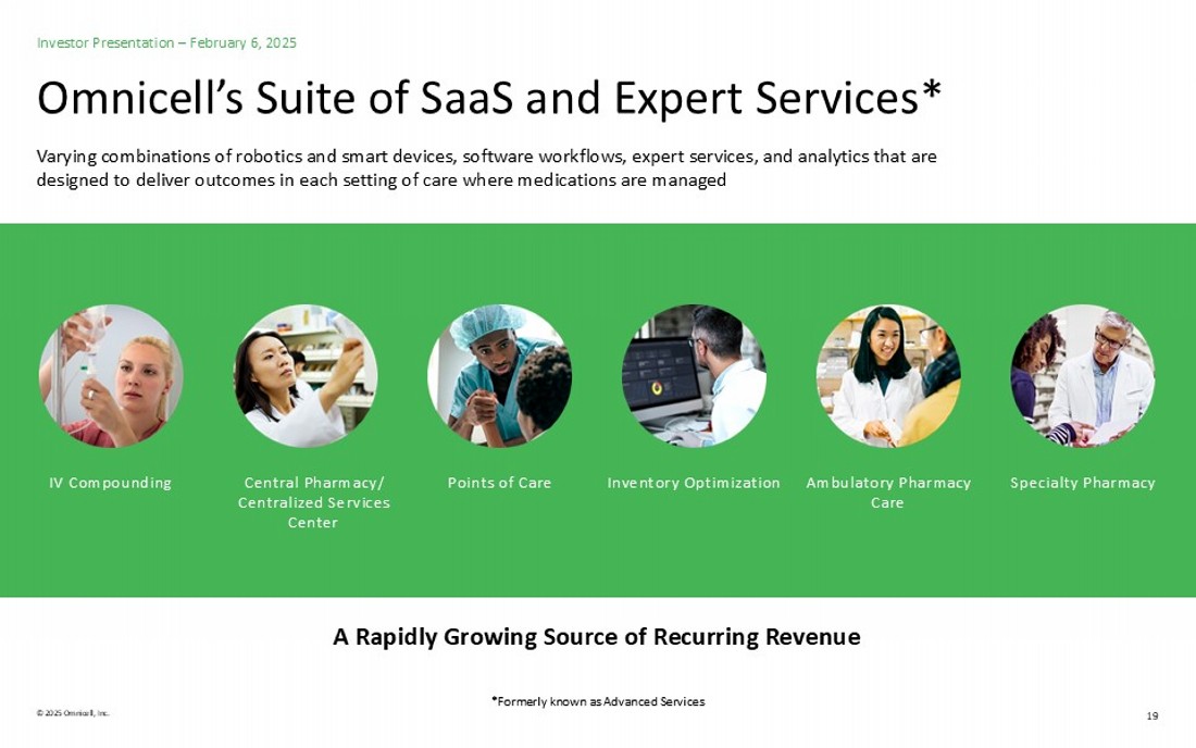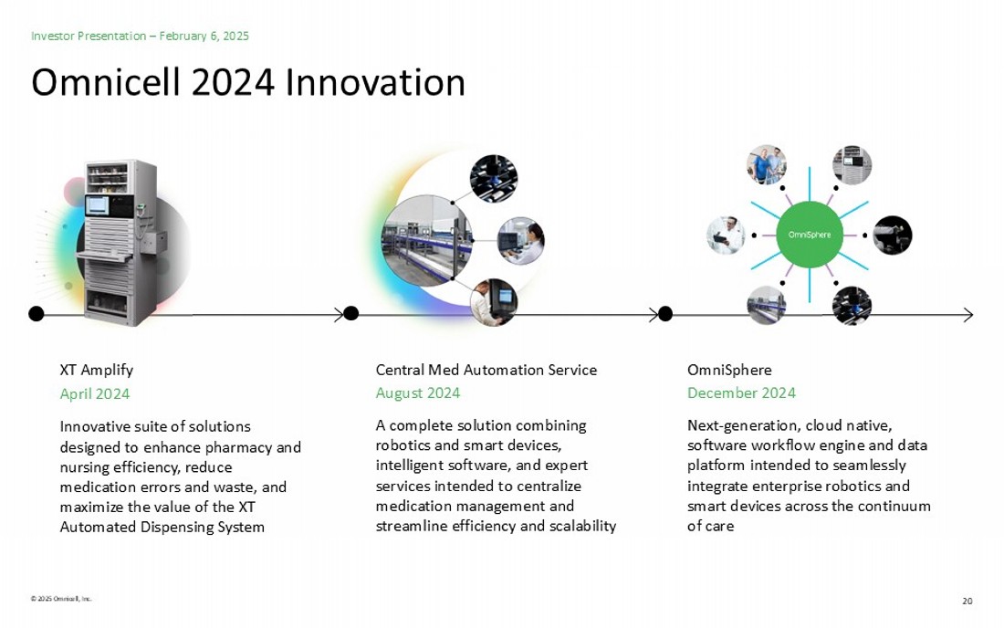This presentation contains “forward - looking statements” within the meaning of federal securities laws. These forward - looking sta tements include statements with respect to 2025 guidance, strategic and growth opportunities, other expectations and other non - historical information. Without limiting the foregoing, statements including the words “expect,” “intend,” “may,” “will,” “should,” “would,” “could,” “p lan,” “potential,” “anticipate,” “believe,” “forecast,” “guidance,” “outlook,” “goals,” “target,” “estimate,” “seek,” “predict,” “project,” and similar expressions are intended to i den tify forward - looking statements. Forward - looking statements are subject to the occurrence of many events outside Omnicell’s control and are subject to various risks and uncertainties, including those described below. Among other t hin gs, there can be no assurance that Omnicell’s actual results will not differ, perhaps substantially, from the targets and expectations contained in this presentation. Such statements also include, but are not limited to, Omnicell’s projected product bookings, annual recurring revenues, reven ues , including product, service, technical services and SaaS and Expert Services revenues, respectively, non - GAAP EBITDA, and non - GAAP earnings per share; expectations regarding our planned and existing products and services, developing new or enhancing existing products and solutions, and the related objectives and expected benefits (and any implied financial impact); our ability to deliver long - term growth, value and consistent GAAP profitability; and statem ents about Omnicell’s strategy, plans, objectives, vision, promise, purpose and guiding principles, goals, including its innovation, environment, social and governance goals and strategies, transitioning to selling more products and se rvices on a subscription basis, market or Company outlook, planned investments, and growth opportunities. Actual results and other events may differ significantly from those contemplated by forward - looking statements due to numerous f actors that involve substantial known and unknown risks and uncertainties. These risks and uncertainties include, among other things, ( i ) unfavorable general economic and market conditions, including the impact and duration of inflationary pressures, (ii) Omnic ell ’s ability to take advantage of growth opportunities and develop and commercialize new solutions and enhance existing solutions, (iii) reduction in demand in the capital equipment market or redu cti on in the demand for or adoption of our solutions, systems, or services, (iv) delays in installations of our medication management solutions or our more complex medication packaging systems, (v) risks related to Omnicell’s investments in new business strategies or initiatives, including its transition to selling more products and services on a subscription basis, and its ability to acquire companies, businesses, or technologies and successfully integrate such acquisi tio ns, (vi) ability to realize the benefits of our expense containment initiatives, (vii) risks related to failing to maintain expected service levels when providing our SaaS and Expert Services or retaining our SaaS and Expert Services custom ers , (viii) Omnicell’s ability to meet the demands of, or maintain relationships with, its institutional, retail, and specialty pharmacy customers, (ix) risks related to climate change, legal, regulatory or market measures to address clima te change and related emphasis on ESG matters by various stakeholders, (x) changes to the 340B Program, (xi) risks related to the incorporation of artificial intelligence technologies into our products, services and processes or our v end ors offerings, (xii) Omnicell’s substantial debt, which could impair its financial flexibility and access to capital, (xiii) covenants in our credit agreement could restrict our business and operations, (xiv) continued and increased competitio n f rom current and future competitors in the medication management automation solutions market and the medication adherence solutions market, (xv) risks presented by government regulations, legislative changes, fraud and anti - kickb ack statues, products liability claims, the outcome of legal proceedings, and other legal obligations related to healthcare, privacy, data protection, and information security, and the costs of compliance with, and potential liability ass ociated with, our actual or perceived failure to comply with such obligations, including any potential governmental investigations and enforcement actions, litigation, fines and penalties, exposure to indemnification obligations or other liabilities, and adverse publicity related to the same; (xvi) any disruption in Omnicell’s information technology systems and breaches of data security or cyber - attacks on its systems or solutions, including the previously disclose d ransomware incident and any potential adverse legal, reputational, and financial effects that may result from it and/or additional cybersecurity incidents, as well as the effectiveness of business continuity plans during any futur e c ybersecurity incidents, (xvii) risks associated with operating in foreign countries, (xviii) Omnicell’s ability to recruit and retain skilled and motivated personnel, (xix) Omnicell’s ability to protect its intellectual property, (xx) risks re lated to the availability and sources of raw materials and components or price fluctuations, shortages, or interruptions of supply, (xxi) Omnicell’s dependence on a limited number of suppliers for certain components, equipment, and raw materials, as well as technologies provided by third - party vendors, (xxii) fluctuations in quarterly and annual operating results may make our future operating results difficult to predict, (xxiii) failing to meet (or significantl y e xceedi