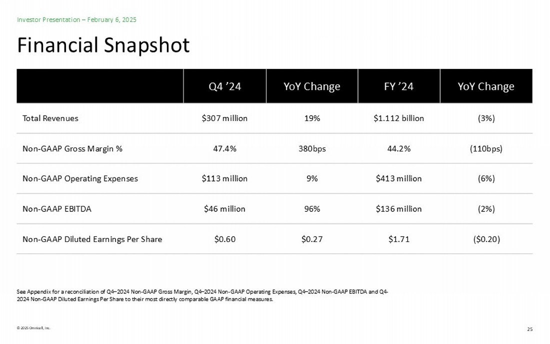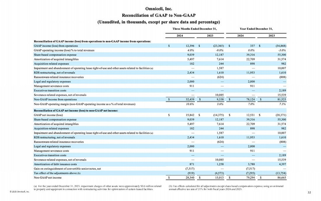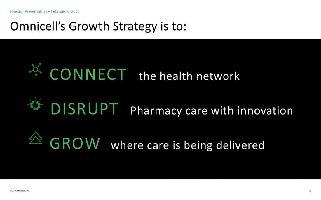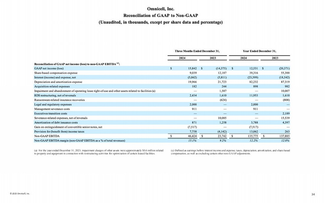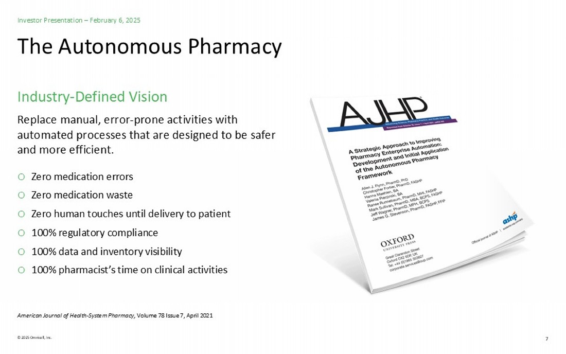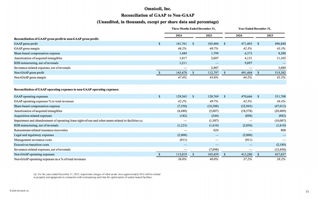 This presentation contains “forward - looking statements” within the meaning of federal securities laws. These forward - looking sta tements include statements with respect to 2025 guidance, strategic and growth opportunities, other expectations and other non - historical information. Without limiting the foregoing, statements including the words “expect,” “intend,” “may,” “will,” “should,” “would,” “could,” “p lan,” “potential,” “anticipate,” “believe,” “forecast,” “guidance,” “outlook,” “goals,” “target,” “estimate,” “seek,” “predict,” “project,” and similar expressions are intended to i den tify forward - looking statements. Forward - looking statements are subject to the occurrence of many events outside Omnicell’s control and are subject to various risks and uncertainties, including those described below. Among other t hin gs, there can be no assurance that Omnicell’s actual results will not differ, perhaps substantially, from the targets and expectations contained in this presentation. Such statements also include, but are not limited to, Omnicell’s projected product bookings, annual recurring revenues, reven ues , including product, service, technical services and SaaS and Expert Services revenues, respectively, non - GAAP EBITDA, and non - GAAP earnings per share; expectations regarding our planned and existing products and services, developing new or enhancing existing products and solutions, and the related objectives and expected benefits (and any implied financial impact); our ability to deliver long - term growth, value and consistent GAAP profitability; and statem ents about Omnicell’s strategy, plans, objectives, vision, promise, purpose and guiding principles, goals, including its innovation, environment, social and governance goals and strategies, transitioning to selling more products and se rvices on a subscription basis, market or Company outlook, planned investments, and growth opportunities. Actual results and other events may differ significantly from those contemplated by forward - looking statements due to numerous f actors that involve substantial known and unknown risks and uncertainties. These risks and uncertainties include, among other things, ( i ) unfavorable general economic and market conditions, including the impact and duration of inflationary pressures, (ii) Omnic ell ’s ability to take advantage of growth opportunities and develop and commercialize new solutions and enhance existing solutions, (iii) reduction in demand in the capital equipment market or redu cti on in the demand for or adoption of our solutions, systems, or services, (iv) delays in installations of our medication management solutions or our more complex medication packaging systems, (v) risks related to Omnicell’s investments in new business strategies or initiatives, including its transition to selling more products and services on a subscription basis, and its ability to acquire companies, businesses, or technologies and successfully integrate such acquisi tio ns, (vi) ability to realize the benefits of our expense containment initiatives, (vii) risks related to failing to maintain expected service levels when providing our SaaS and Expert Services or retaining our SaaS and Expert Services custom ers , (viii) Omnicell’s ability to meet the demands of, or maintain relationships with, its institutional, retail, and specialty pharmacy customers, (ix) risks related to climate change, legal, regulatory or market measures to address clima te change and related emphasis on ESG matters by various stakeholders, (x) changes to the 340B Program, (xi) risks related to the incorporation of artificial intelligence technologies into our products, services and processes or our v end ors offerings, (xii) Omnicell’s substantial debt, which could impair its financial flexibility and access to capital, (xiii) covenants in our credit agreement could restrict our business and operations, (xiv) continued and increased competitio n f rom current and future competitors in the medication management automation solutions market and the medication adherence solutions market, (xv) risks presented by government regulations, legislative changes, fraud and anti - kickb ack statues, products liability claims, the outcome of legal proceedings, and other legal obligations related to healthcare, privacy, data protection, and information security, and the costs of compliance with, and potential liability ass ociated with, our actual or perceived failure to comply with such obligations, including any potential governmental investigations and enforcement actions, litigation, fines and penalties, exposure to indemnification obligations or other liabilities, and adverse publicity related to the same; (xvi) any disruption in Omnicell’s information technology systems and breaches of data security or cyber - attacks on its systems or solutions, including the previously disclose d ransomware incident and any potential adverse legal, reputational, and financial effects that may result from it and/or additional cybersecurity incidents, as well as the effectiveness of business continuity plans during any futur e c ybersecurity incidents, (xvii) risks associated with operating in foreign countries, (xviii) Omnicell’s ability to recruit and retain skilled and motivated personnel, (xix) Omnicell’s ability to protect its intellectual property, (xx) risks re lated to the availability and sources of raw materials and components or price fluctuations, shortages, or interruptions of supply, (xxi) Omnicell’s dependence on a limited number of suppliers for certain components, equipment, and raw materials, as well as technologies provided by third - party vendors, (xxii) fluctuations in quarterly and annual operating results may make our future operating results difficult to predict, (xxiii) failing to meet (or significantl y e xceedi