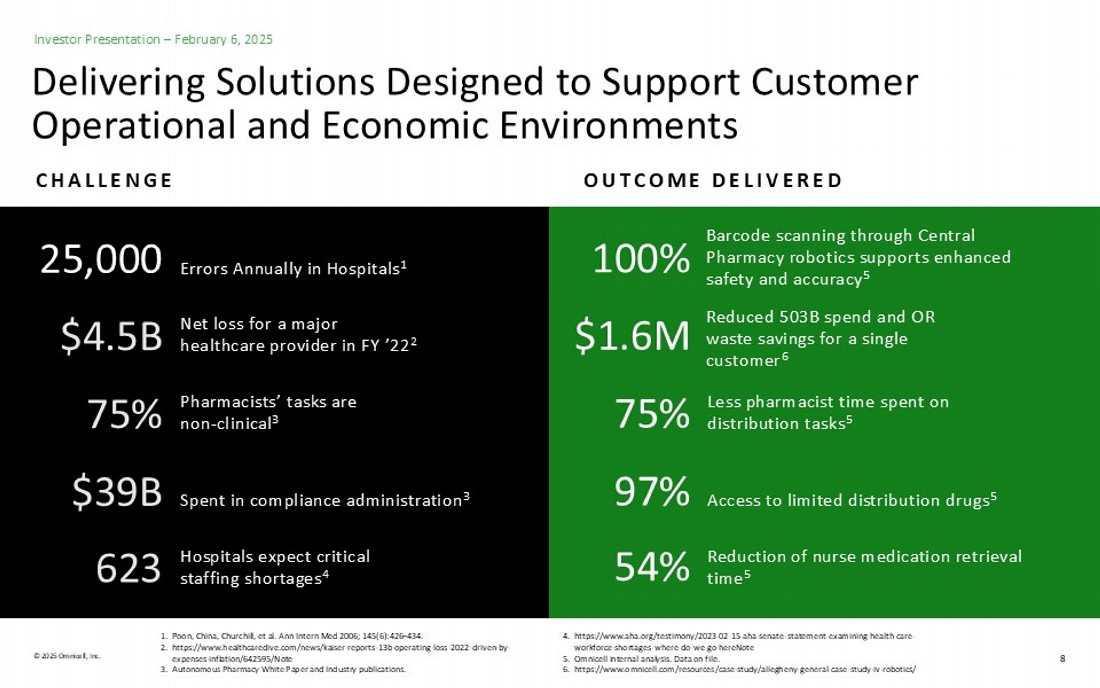 The Autonomous Pharmacy Investor Presentation – February 6, 2025 Industry - Defined Vision Replace manual, error - prone activities with automated processes that are designed to be safer and more efficient. o Zero medication errors o Zero medication waste o Zero human touches until delivery to patient o 100% regulatory compliance o 100% data and inventory visibility o 100% pharmacist’s time on clinical activities American Journal of Health - System Pharmacy, Volume 78 Issue 7, April 2021 © 2025 Omnicell, Inc. 7
