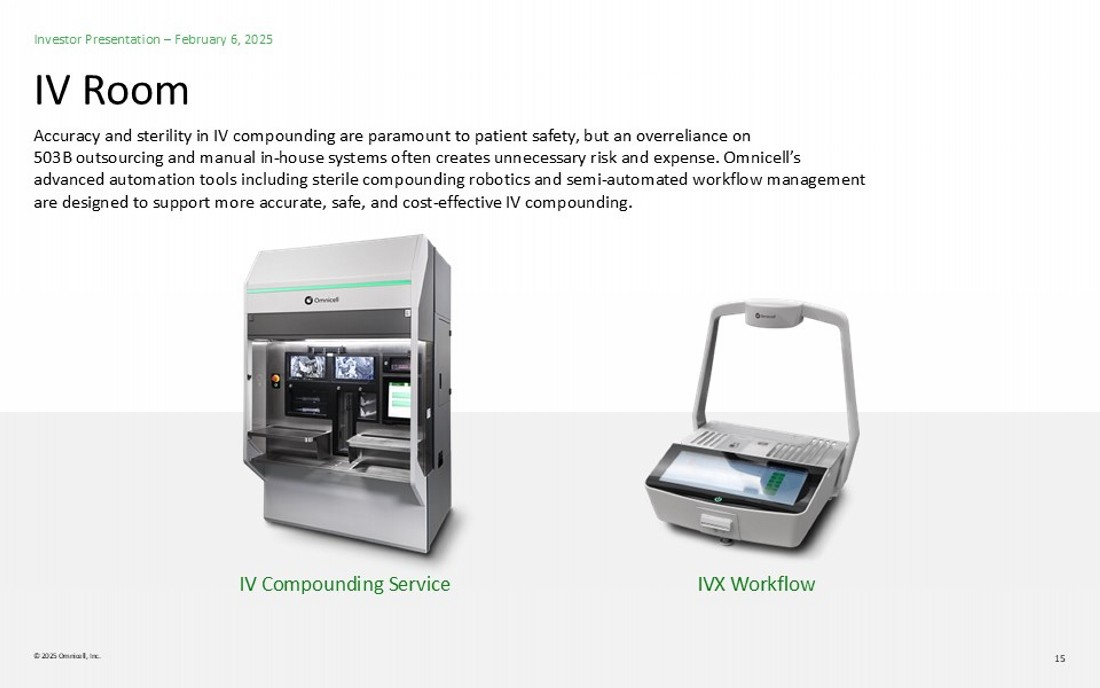 © 2025 Omnicell, Inc. 14 Central Pharmacy Pharmacy Carousel Inventory Optimization Service Central Pharmacy Dispensing Service Investor Presentation – February 6, 2025 Central pharmacy is the medication dispensing hub of most hospitals. Roadblocks that surface here have the potential to impact patient safety, care, and clinical workflows throughout the health system. Omnicell automates manual dispensing tasks in an effort to reduce errors and waste, improve accuracy, and give valuable human resources more time to focus on the work that matters most — patient care .