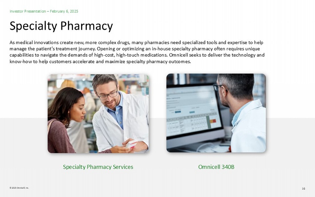 © 2025 Omnicell, Inc. 15 IV Room IVX Workflow IV Compounding Service Investor Presentation – February 6, 2025 Accuracy and sterility in IV compounding are paramount to patient safety, but an overreliance on 503B outsourcing and manual in - house systems often creates unnecessary risk and expense. Omnicell’s advanced automation tools including sterile compounding robotics and semi - automated workflow management are designed to support more accurate, safe, and cost - effective IV compounding.